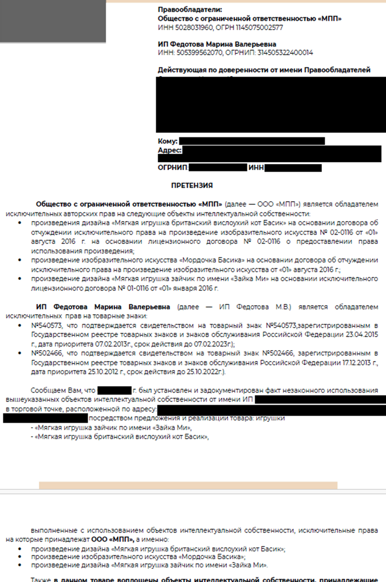 Расскажем в этой статье, что нужно делать, если Вы попали в такую ситуацию. Первое, что нужно сделать - внимательно ознакомиться с текстом полученной претензии / искового заявления. В этом документе будет указано, что за товар был приобретен в Вашем магазине, дата закупки, предполагаемые нарушения и другие важные обстоятельства. Как показывает практика, в случае с ИП Федотова М.В., речь идет о продаже/предложении к продаже игрушек - ЗАЙКА МИ или КОТ БАСИК. Более подробную информацию Вы можете узнать из нашей статьи (https://dzen.ru/a/ZecVNUEsQxvSzTNd). Вы можете направить в сообщения в нашем ВК-сообществе (https://vk.com/public220446345) текст претензии/искового заявления и все приложения, наши юристы бесплатно изучат эти документы и проконсультируют Вас по перспективам данного дела. Также связаться с нами можно по электронной почте Lar270102@yandex.ru или в Телеграмм в сообщения, перейдя по ссылке: https://t.me/Julia_Larionova1904 Также прикрепляем к посту некоторые судебные решения