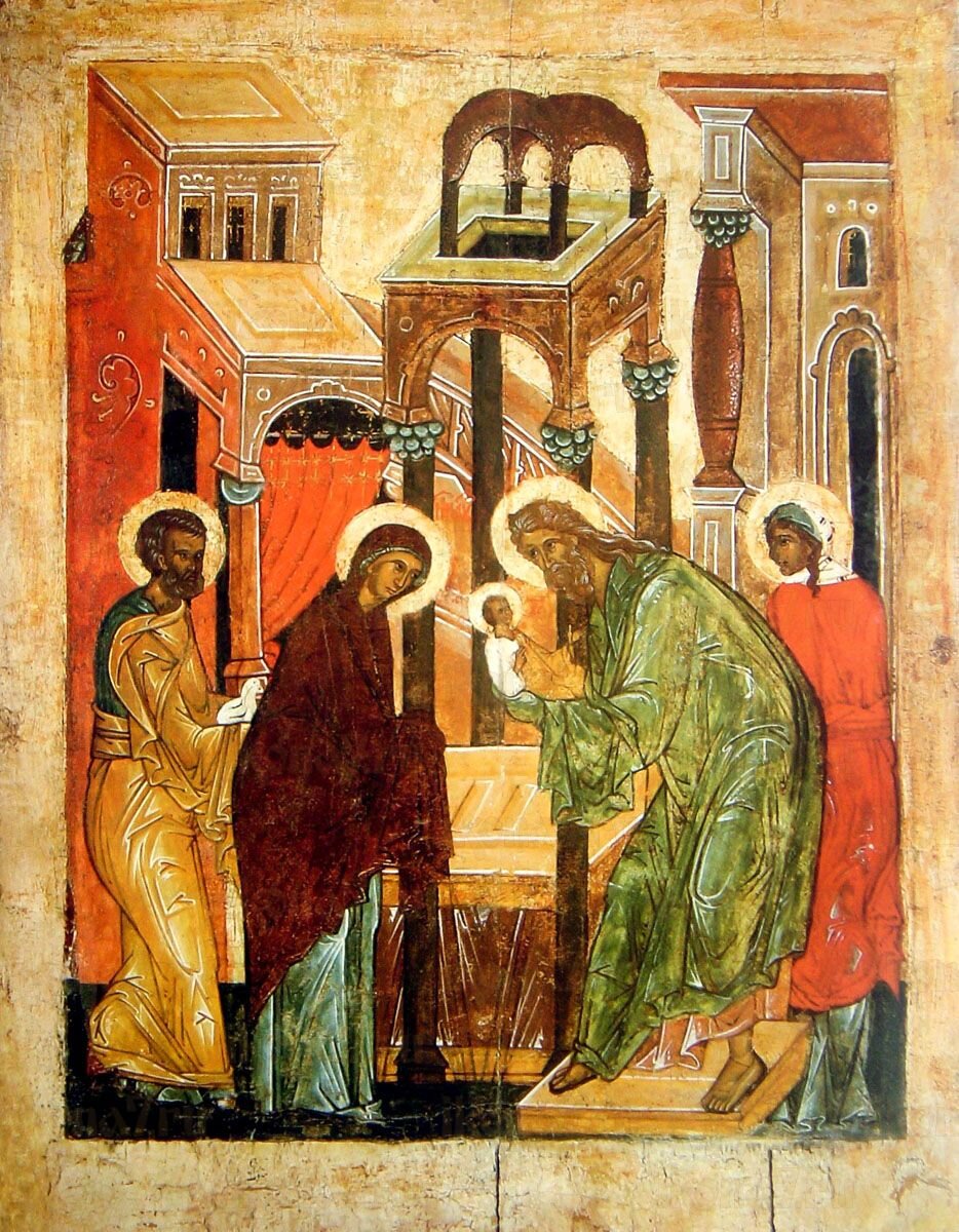 В Иерусалимском храме Ветхий Завет в лице Симеона Богоприимца и Анны пророчицы встретился с Новым Заветом, Младенцем Иисусом, лежащим на руках Пречистой Девы.