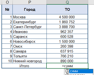 Задачи на суммирование исходных данных встречаются очень часто. Для того чтобы сложить значения, нужно воспользоваться функцией СУММ. Кстати функцию СУММ можно вызвать одновременным нажатием горячих клавиш ALT и = Рассмотрим на примере. Нужно сложить весь товарооборот по городам. Ставим = в ячейке, в которой должен быть итог. Вписываем формулу СУММ, выбираем ее из выпадающего списка. Далее выбираем диапазон, который нужно сложить: И нажимаем на клавиатуре ENTER. В ячейке получился итог