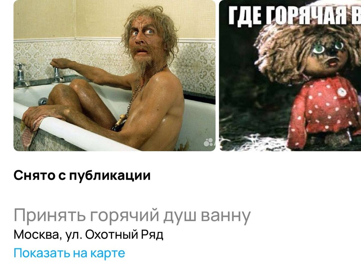 В нем все грамотно продумано: запоминающиеся картинки , правильная геометка (многие ставят центр Москвы Охотный ряд для бОльших охватов), юмористическое описание, актуальность услуги (каждое лето в Москве отключают горячую воду).