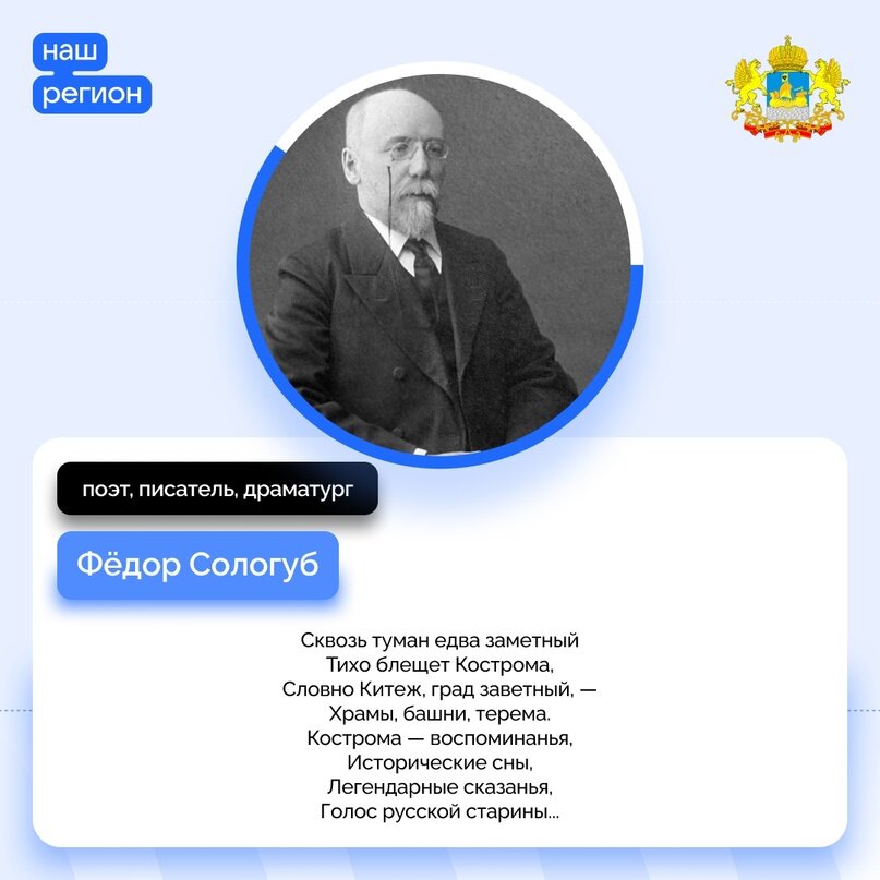 Фёдор Сологуб оказался в Костроме в один из самых сложных периодов своей жизни. В первые послереволюционные годы поэт страдал от безденежья. Стремясь завоевать расположение чиновников и урегулировать свои имущественные права, он летом 1921 г. отправился в Кострому для чтения лекций в местном рабоче-крестьянском университете. Сологуб жил в доме, где располагалась гостиница «Старый двор». Также поэт проводил много времени на даче под Костромой. Этот загородный дом он любил особо и даже обращался к местным властям с просьбой оставить ему имение в пожизненное пользование. Кострома вдохновила литератора на несколько произведений. В одном из стихотворений, отрывок из которого на нашей карточке, образ города приобретает символическую глубину, поэт сравнивает его с заветным градом Китежем. Этот мотив символизирует надежду на спасение и сохранение русской культуры и духовности в трудные времена. #КостромскаяОбласть #Цитата