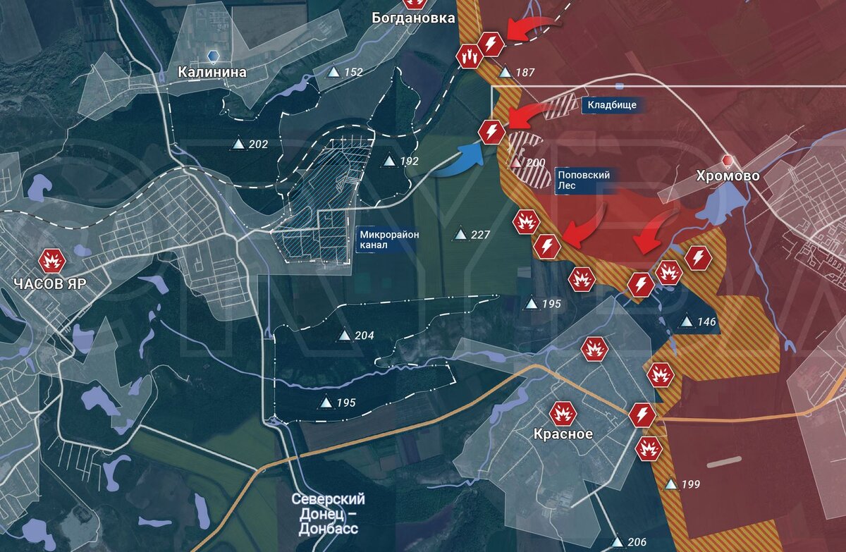 ВС России, заняв позиции пр-ка южнее Богдановки, основные силы бросили не на освобождение этого села, а на юг – к Красному. Киевские стратеги это профукали и сейчас уже Красное постепенно попадает в клещи – наши охватывают село и с севера. Ехидно замечу, Сырскому и Ко нужно меньше верить нашим ТГ и СМИ, уже пару месяцев рассказывающих о том, что наша ближайшая цель – освобождение Богдановки и атака ЧасЯра. Нет, как мы с вами и говорили не раз, цель – Красное. Ну а девушки… а Часов Яр потом. В остальном фронт от Орехово-Васильевки на севере до Торецка на юге стабилен – штурм относительно крупных н.п. /того же Торецка/ находится за рамками стратегии гибкой обороны, которой мы будем придерживаться еще несколько месяцев. В Авдеевки разгром пр-ка идёт по плану. … Как обычно при боях в городской застройке подтверждение геоданными запаздывает, но факт боев за а/б подтверждает и пр-к. Говорят и о продвижении наших вдоль Голубых озер к з-ду кварцевых песков, и о потере ВСХ дач севернее а