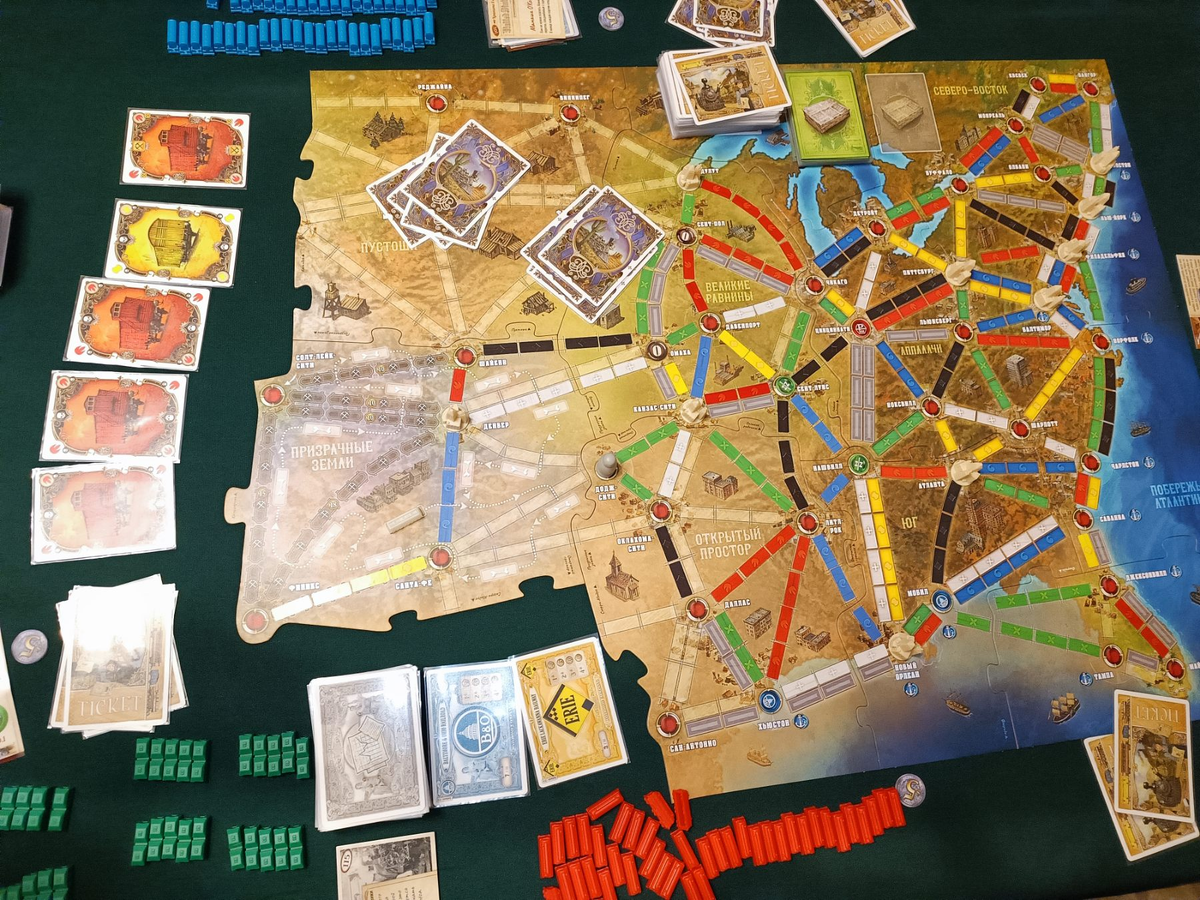 Внимание! В этой статье будут спойлеры. Если планируете проходить эту игру, прочитайте ее после прохождения!!! Восьмую партию кампании мы начинали с такой картой Для игры пришлось уже раскладывать стол, на зато это добавило комфорта. Вначале партии я взял все 4 маршрута. Два из них шли в Цинциннати, и я решил сделать этот город центром своих дорог в этой партии. В процессе партии вышло событие, при котором игроки могли взять вне хода три маршрута, но оставить как минимум один. Мне повезло, я оставил дорогой маршрут, для которого мне нужно было пройти три новых перегона. Ближе к концу партии я взял еще маршруты, оставил два, но успел выполнить только один. Благодаря карте сотрудника Билетер, я сбросил карту не выполненного маршрута, и не получил минус 14 долларов. Жене не повезло, ее маршруты совпадали с маршрутами Лизы, у них развязалась жаркая борьба за перегоны вдоль восточного побережья. Снова вышло событие "Найти ущелье мертвеца" но ни у кого из нас не было четырех карт для сбро