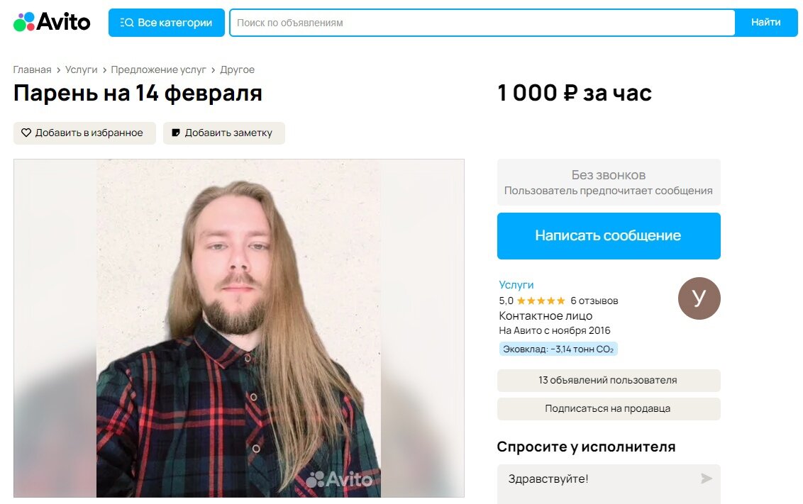 Ребята готовы сходить в ресторан, сфотографироваться, подержаться за ручку и даже приобнять, разумеется за деньги. Разбираемся в ценах, причинах и сколько предложений от девушек на этом рынке. В день влюбленных старается заработать каждый, начиная от рестораторов и флористов, до ювелиров и продавцов мягких игрушек. Но на рынке появилась новая ниша — «парень на 14 февраля». Услуга активно набирает популярность и в основном располагается на просторах сайта частных объявлений Авито. Сейчас в Казани свободны несколько парней, цены, скажем так, не хилые. Например, сходить в ресторан с молодым человеком стоит две тысячи рублей, счет оплачивает заказчик самостоятельно. Подарить букет — одна тысяча рублей, цветы, разумеется, за ваш счет. Взяться за ручки — 500 рублей, посмотреть фильм в кинотеатре — две тысячи, а приобнять — ровно тысяча.