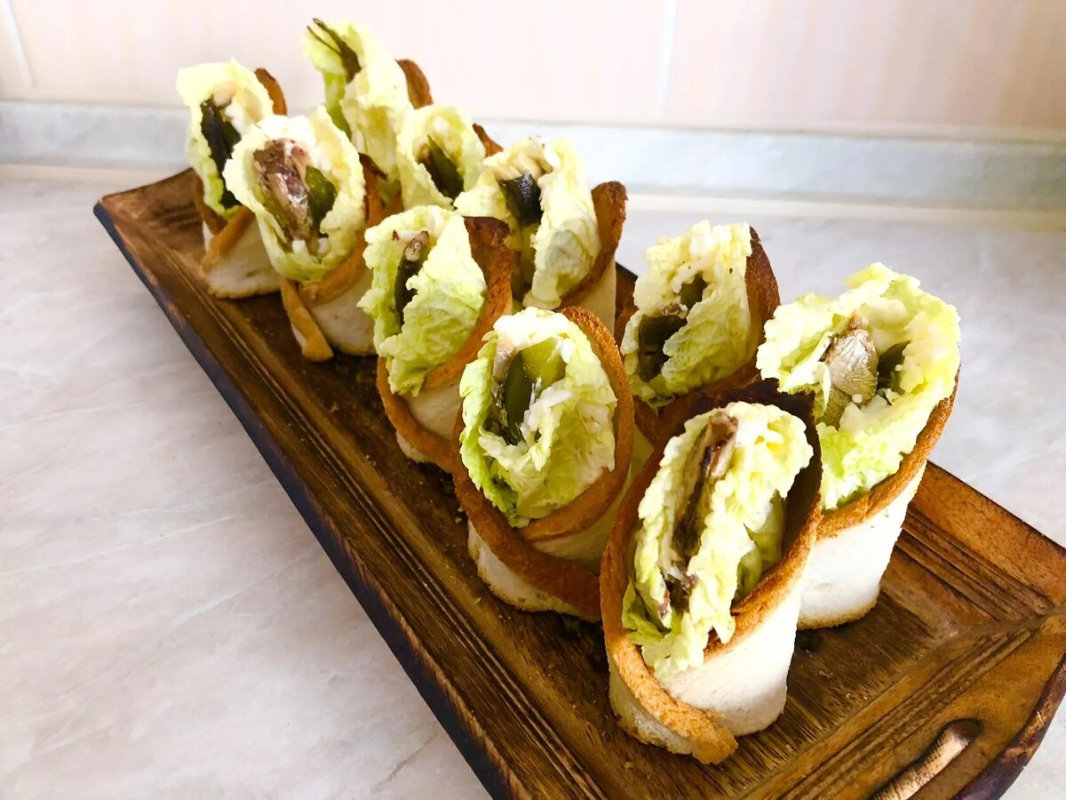 Наткнулась на этот рецептик во всем известной запрещенной соцсети, когда искала варианты закусок на стол ко дню рождения мужа. Понравился он мне своей необычной подачей. Решила попробовать приготовить. Вы знаете, нам так понравилось, что со стола смели эти закусочки просто вмиг. Хрустящий хлебушек, сочный листик салата с нежным сыром, маринованным огурчиком и шпротинкой очень пришлись нам по вкусу. А как симпатично и оригинально они смотрятся на тарелочке! Поделюсь-ка я, пожалуй, этим рецептом и с вами, мои дорогие подписчики. Ингредиенты: тостовый хлеб, шпроты, плавленый сырок (типа "Дружба", "Орбита" и т.п.), чеснок, маринованный огурчик, листья салата или пекинская капуста, майонез, Пошаговый рецепт приготовления: Тостовый хлебушек нарезаем треугольничками. Каждый треугольничек раскатываем скалкой. Скрепляем концы треугольника зубочисткой. Противень застилаем пергаментной бумагой, выставляем на него хлебушек и отправляем в заранее разогретую до 180 градусов духовку на 7- 8 минут. З
