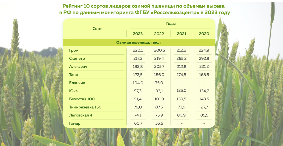 В 2023 году в рейтинге 10 - сортов лидеров озимой пшеницы по данным мониторинга ФГБУ «Россельхозцентр» первенство занял сорт Гром сместив на вторую позицию Скипетр.