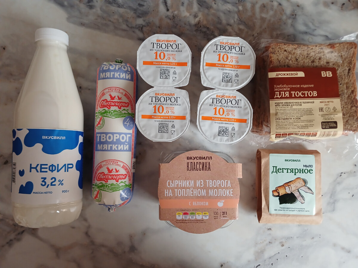 На этот месяц я выделяла на продукты 20 тыс руб. Это по 5 тыс на человека в месяц. Плюс еще 1 тыс руб на стол к 23 февраля. О моих запасах продуктов на начало месяца и бюджете на питание можно почитать ЗДЕСЬ Первая покупка продуктов была на 5013 руб. Остаток денег на продукты 14 987 руб Вторая покупка продуктов была на 7530 руб Остаток денег на продукты 7457 руб ВКУСВИЛЛ покупка № 1 по зеленым ценникам: творог Свитлогорье 99 руб, сырники из творога на топленом молоке 103,6 руб, кефир 56,5 руб, тостовый хлеб 52 руб как Любимый продукт творог мягкий из топленого молока, 53 руб/120 г. Ооочень вкусный! И он без сахара 👌 еще покупала дегтярное мыло. Интересно, что здесь оно от "Спивак", стоит почти в 2 раза дешевле, чем их же мыло на маркетплейсах. При первом заказе во Вкусвилл скидка 200 руб от 1000 руб по промокоду VS1572 и бесплатная доставка покупка №2 заезжала в магазин. Не густо, но кое-что было по ЗЦ несколько бананов по ЗЦ 78 руб/кг, бананы египетские творожный сырок с изюмом (о