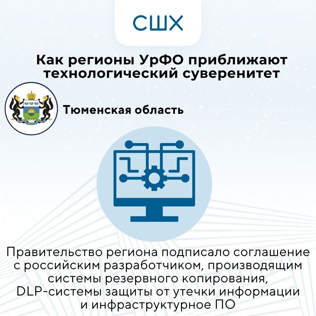 ▶️ Правительство Тюменской области подписало соглашение с российским разработчиком, производящим системы резервного копирования, DLP-системы защиты от утечки информации и инфраструктурное ПО. Российские айтишники обязуются содействовать в импортозамещении и социально-экономическом развитии региона. ▶️ В Тюменской области тобольский завод по производству полиэтилена за выпуск прочных пленок для ламинации, изготовление пакетов и упаковки получил золотой логотип «100 лучших товаров России» в категории «Продукция производственно-технического назначения». А за выпуск полиэтилена, предназначенного для изготовления саженаполненных труб, соединительных частей напорных водопроводов и систем газоснабжения, — серебряный логотип. ▶️ В Ямало-Ненецком автономном округе предлагают разработать цифровой сервис, работающий на базе искусственного интеллекта, для госзакупок. Специальный сервис, не имеющий аналогов, будет анализировать информацию о ценах на товары из открытых источников в интернете по за