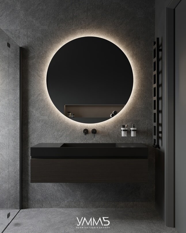 Данное помещение выполнено в фактурной объемной плитке под камень, что придает брутальности. Над подвесной раковиной установлено круглое зеркало с подсветкой, а напротив, над унитазом, создана открытая также подсвечиваемая ниша для хранения. Зона душа спроектирована без подиума и отгорожена стеклянной перегородкой.