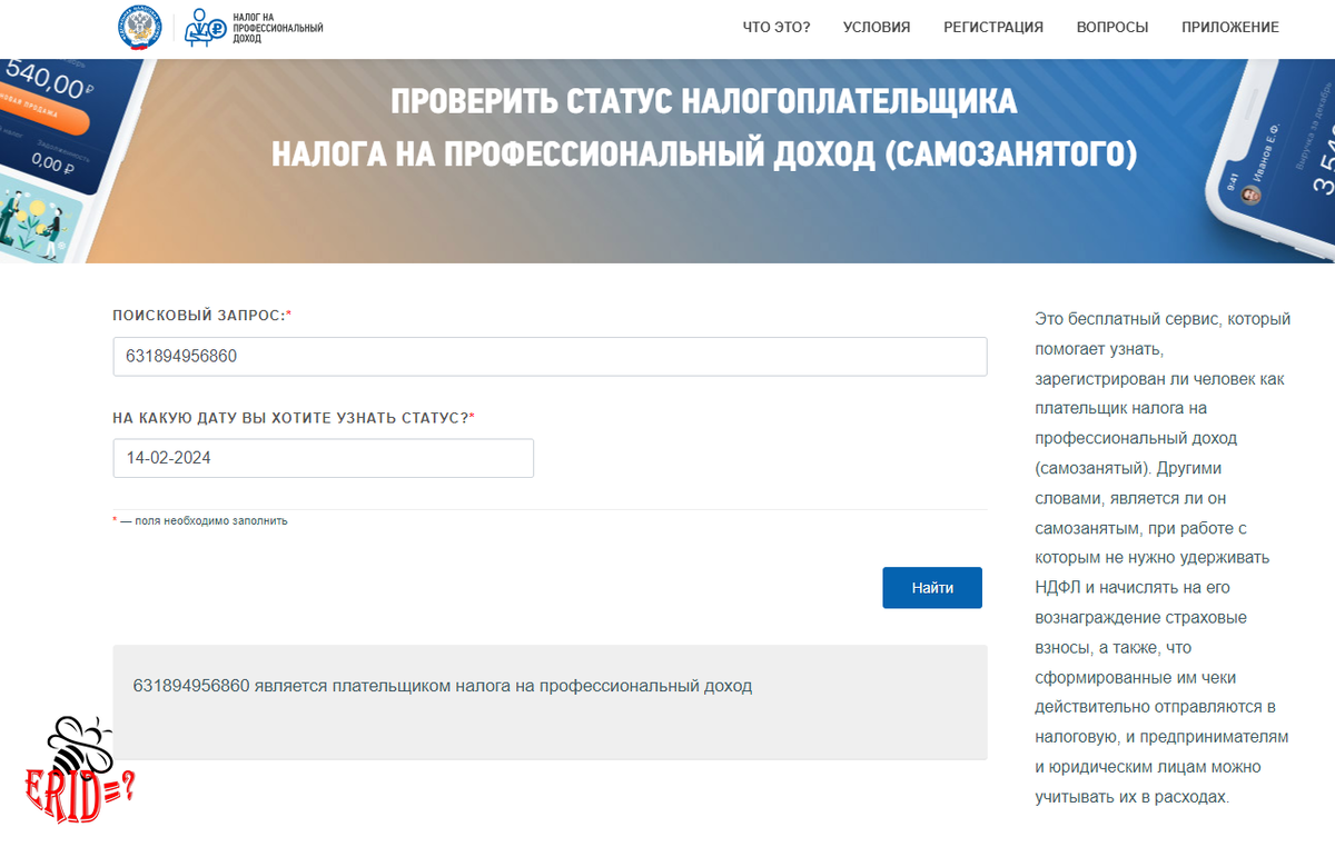 В связи с введением маркировки интернет-рекламы на рынке появились не совсем порядочные участники, которые могут для передачи данных в ОРД и ЕРИР предоставить неверные данные. Как проверить контрагента, с которым заключаете договор на размещение рекламы. Проверка юр.лиц и ИП Способ 1 Введите ИНН ХХХХХХХХХХХХ или ОГРН YYYYYYYYYYYYY в поисковую строку Яндекс. Большая вероятность, что в выдаче вы получите карточку предприятия, составленную по данным ФНС. Способ 2 По ссылке https://egrul.nalog.ru/index.html вы можете получить выписку из ЕГРЮЛ/ ЕГРИП в электронном виде. Достаточно внести тот же ИНН или ОГРН/ ОГРНИП. Проверка самозанятых Самозанятость легко оформляется, но также легко отказаться от статуса самозанятого. Полные данные контрагента мы не узнаем, но можем проверить, является ли он плательщиком НПД на сегодняшний день. Для этого перейдем на сайт https://npd.nalog.ru/check-status/, укажем ИНН плательщика НПД и сегодняшнюю дату. В результате получим информацию, является ли данное л