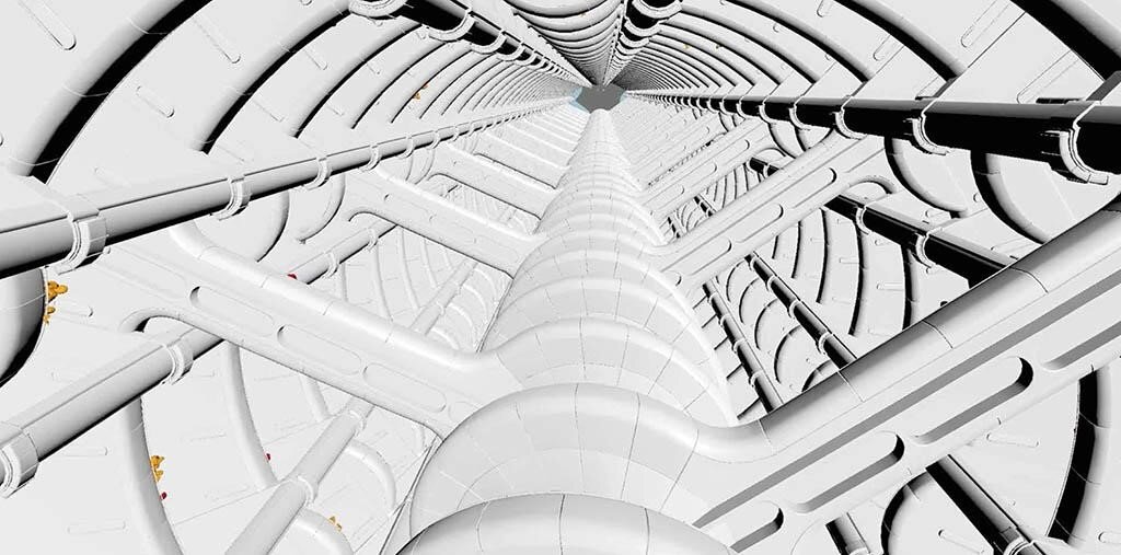 Прошлым летом на площадке Apple TV+ вышел минисериал «Бункер» по трилогии научно-фантастических романов Хью Хауи. Это история последних десяти тысяч людей, живущих под землей во время ядерного постапокалипсиса. Почти весь антураж 144-этажного бункера – это 3D конструкция, созданная силами VFX художников таких студий, как MPC, Outpost VFX, Rodeo FX, DNEG, Zoic Studios и FuseFX. Основными вендорами были MPC и Outpost. Всего в сериале 2300 VFX шотов! По сюжету гигантская структура башни диаметром 167 метров уходила вниз спиралью балконов и оканчивалась буровой установкой. Художник постановщик шоу Гавэн Боке построил частичные декорации, окруженные хромакеем. Но для повествования требовалось достроить массивную конструкцию подземного небоскреба. «В плане декораций и создания среды эта история опиралась на визуальные эффекты. Эту конcтрукцию невозможно построить в реале», – говорит VFX супервайзер сериала Дэниел Раухвергер. Концепты были нарисованы арт-департаментом в SketchUp. Но все это