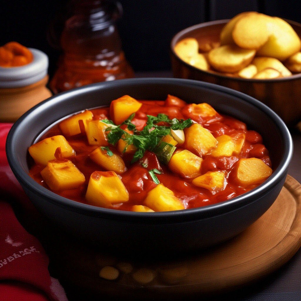 Рецепт: Картофельный гуляш Ингредиенты: - 4-5 крупных картофелин - 2 луковицы - 2 моркови - 2 зубчика чеснока (опционально) - 2 ст. ложки томатной пасты (или кетчупа) - 2 ст. ложки растительного масла - Приправы по вкусу (соль, перец, паприка, сушеный базилик или оregano) Инструкции: 1. Нарежьте картофель на кубики или ломтики, лук и морковь на крупные кусочки. 2. На среднем огне разогрейте растительное масло в большой сковороде или глубокой кастрюле. Добавьте лук и обжаривайте до мягкости, примерно 5-7 минут. 3. Добавьте морковь к луку и готовьте еще 5 минут, пока морковь не станет мягкой. 4. Добавьте нарезанный картофель и чеснок (если используете) в сковороду. Перемешайте и готовьте еще 5 минут. 5. Добавьте томатную пасту (или кетчуп), приправы по вкусу и достаточно воды, чтобы покрыть ингредиенты. Помешивайте, чтобы все ингредиенты хорошо смешались. 6. Подведите к готовности на среднем огне, прикрытые, около 20-25 минут или пока картофель не станет мягким и со