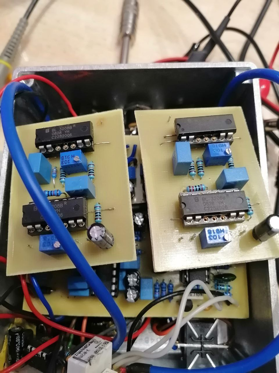 Предыдущая часть Напомню, что у меня в нафаршированном варианте дилея стоят 4 микросхемы 3208, чтобы достигнуть 600 мс задержки. При этом стоят они на самодельных переходниках, на которых я предусмотрел вариант установки подстроечника cancel, но при пайке поставил пару резисторов (поскольку тогдашний осциллограф всё равно не позволял этим подстроечником осознанно пользоваться). И на самой плате aquaboy только для одной из двух микросхем был предусмотрен подстроечник, а для второй - два резистора. Итого можно было скорректировать уровни сигналов на выходах только у одной микросхемы из четырёх. С новым осциллографом я попытался, но особого успеха не достиг, помехи было слышно. Тогда я обратился ко второму очевидному слону в комнате - мои платы адаптеров были подключены на довольно-таки длинных проводках. И хотя я уже один раз предпринимать попытку развести сигналы тактовые подальше от аудио, но полностью успеха достичь мне не удалось. В порыве неправедного гнева я отпаял адаптеры и остал