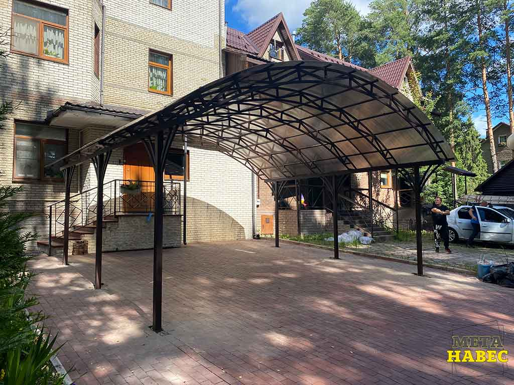 - Тип материала: арочные навесы могут быть изготовлены из различных материалов, таких как металл (сталь, алюминий), дерево или поликарбонат. Каждый материал имеет свои преимущества и недостатки, поэтому выбор зависит от ваших предпочтений и условий использования (например, металлические конструкции более прочные и долговечные, деревянные навесы создают более теплую атмосферу).
