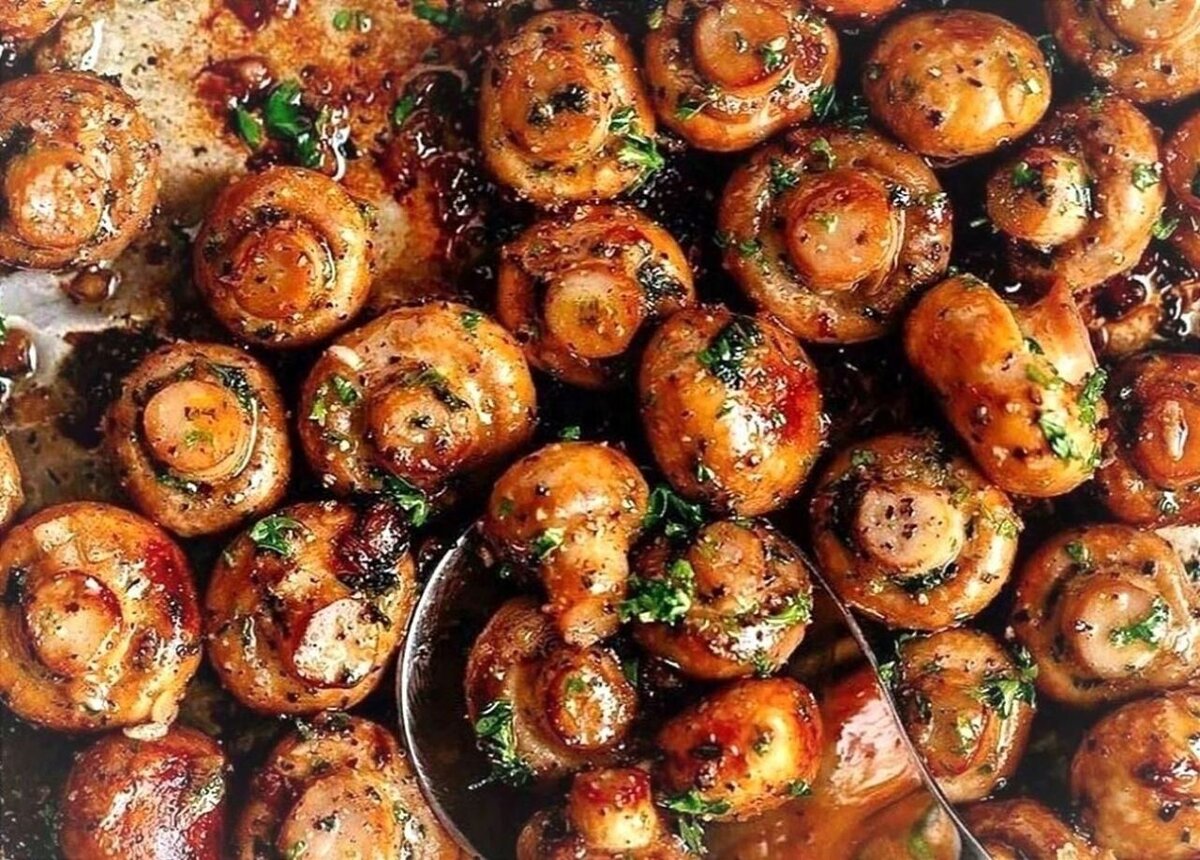 Грибы шампиньоны 1 кг. обжариваем на сливочном масле 150 г., на среднем огне до полуготовности.Затем к ним добавляем 5-6 ст.л. растительного масла,по вкусу тимьян,чеснок,соль,перец черный молотый,соевый соус и тушим под крышкой еще 5 мин. В конце добавляем зелень,перемешиваем и подаем к столу.