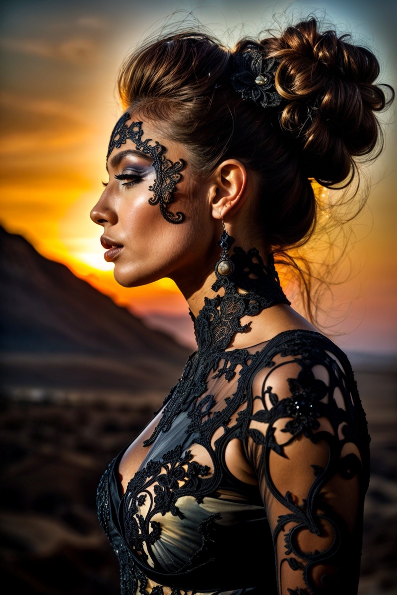 Центральная фигура — боковой силуэт красивой женщины с детализированным освещением лица и теневым телом. Изображения насыщены разнообразными текстурами: от спиртовых чернил и энкаустической живописи до туши и цифрового арта, включая элементы таких уникальных стилей, как работы Грега Рутковского, Тома Бэгшоу и Саббаса Аптеруса.
