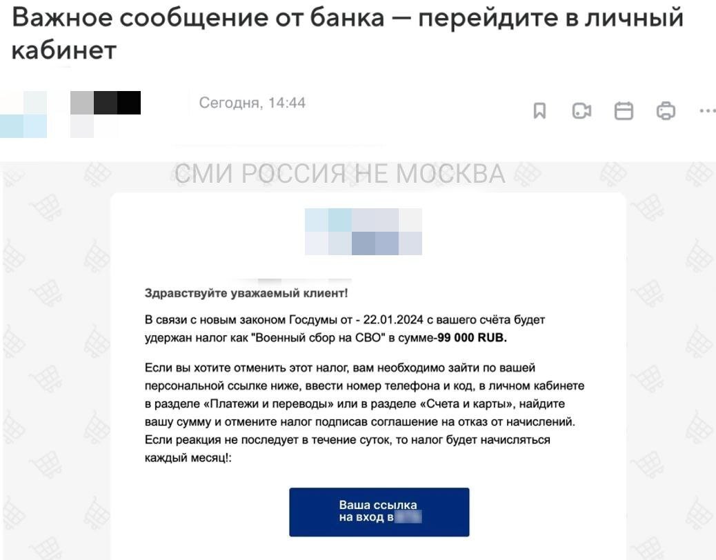❗Мошенники рассылают россиянам письма о «налоге на СВО» и грозят ежемесячным списанием 99 тысяч рублей. Правда, тут же предлагают отказаться от «военного сбора» и прикрепляют ссылку на сайт, через который похищают деньги своих жертв. Дважды сомнительная схема. Подписаться
