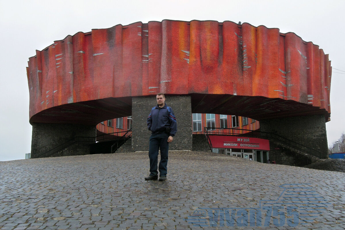 Мирный сосед: как было до 2014 года 2011 год. Этот огненный бублик — музей Николая Островского: Находится он здесь: Да-да, в той самой, про которую есть песня у Любови Успенской. "Сама не ведая, еду я от Москвы до..." Ударение на -о-, если кто не слышал песню. Однако сам Островский не песни писал, он написал книгу «Как закалялась сталь» про Павку Корчагина. Суровое произведение — суровый музей: Возле музея вообще стоит нечто невообразимое — мачтовый укладочный кран УК25/9: Рядом — мачтовый танк-паровоз 9П: Вид на 9П сзади, из музея: Неподалёку — памятник Ильичу, пока ещё целый и даже со свежими цветами: А это река Гуска и стоящая на её берегу фабрика калош — завод «Пульсар», бывший филиал «Радара»: Что он производил и из какой страны родом — без комментариев... Декабрьский день короток, поэтому мне пора грузиться в заднюю кабину ЧС4КВР и ехать дальше: Моменты этой поездки описаны во вступлении к статье «ТЭД-13»: В следующей части взглянем на местную железку, что попала в кадр вместе с