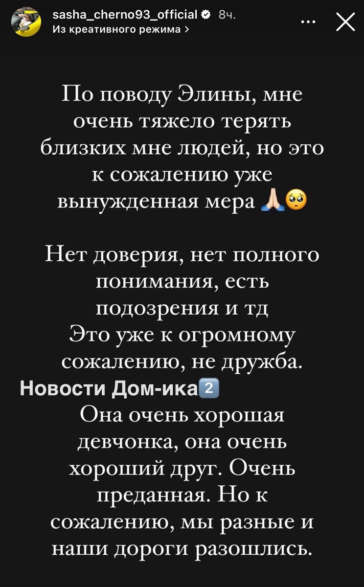 Элина попросила впредь её больше не трогать, для неё тема - дружба с Сашей Черно под запретом.
