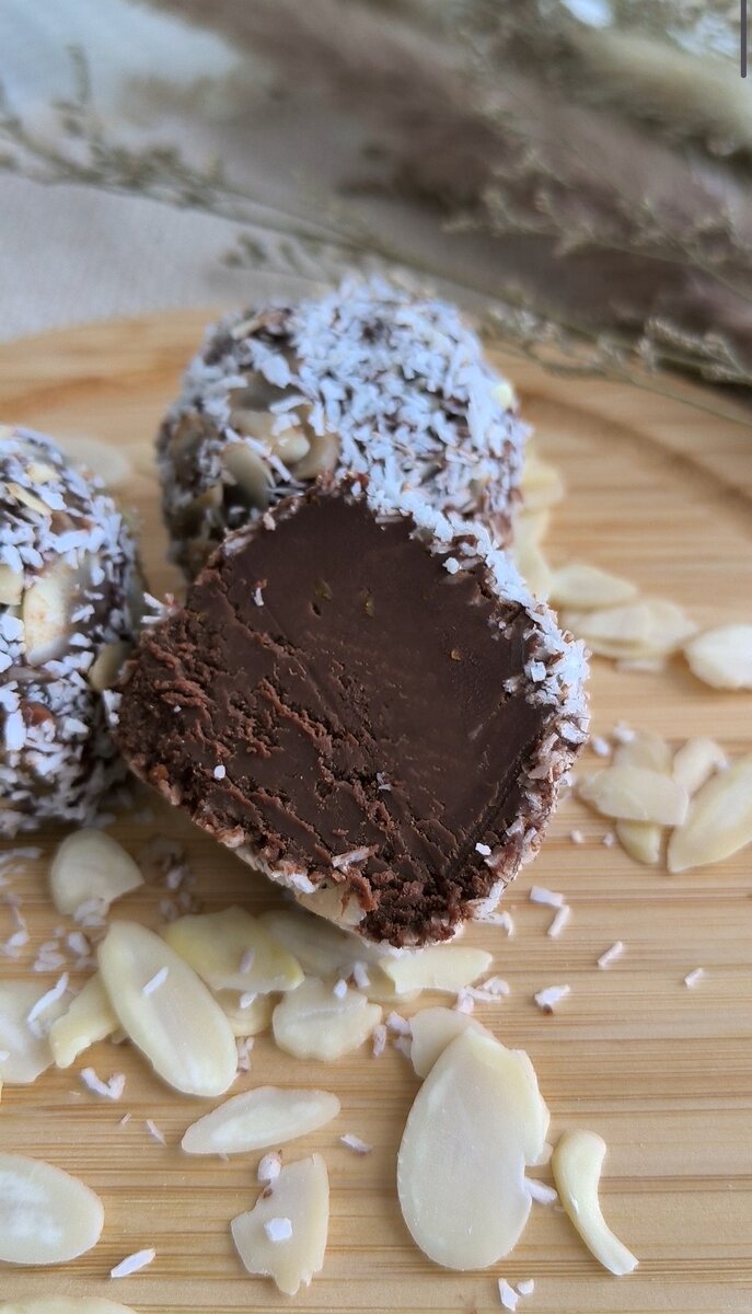 Нежный, обволакивающий, такой, каким должен быть классический шоколадный трюфель🤤 Ингредиенты: ◽ Кокосовое молоко - 2 банки по 400 мл. (можно взять обычные жирные сливки 300 мл.); ◽ Горький или темный шоколад (не менее 70 %) - 300 г.; ◽ Сливочное масло (или масло какао) - 50 г.; ◽ Небольшой апельсин - 1 шт.; ◽ Сироп, подсластитель или сахар, если шоколад несладкий; ◽ Бренди или коньяк - 1-2 ч.л. (по желанию ;) Приготовление: Потребуется небольшая подготовка. Кокосовое молоко необходимо убрать в холодильник на ночь. Сливки поднимутся наверх, а водичка останется внизу. Нас как раз будут интересовать сливки :) От апельсина потребуется цедра без белой части и сок. Необходимо поместить все ингредиенты в сотейник и нагреть, постоянно помешивая. До кипения доводить не потребуется. Снять с плиты, продолжая помешивать. Должна получиться однородная шоколадная масса. Далее два варианта приготовления. Я рекомендую взять силиконовые формы для конфет, разлить смесь и поставить в холодильник д