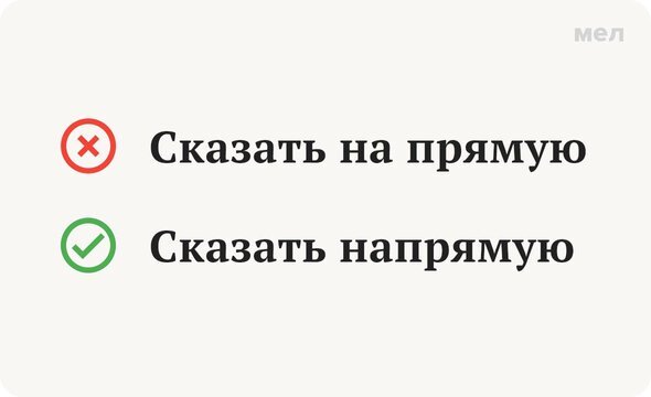 Как и в большинстве примеров «Грамотности на „Меле“», неправильный вариант в любой момент может стать правильным — всё зависит от того, к какой части речи будут принадлежать рассматриваемые слова. Сегодня разбираемся, что перед нами — наречие или прилагательное с предлогом. Правильно: Сказать напрямую Сразу правило (оно универсально): если перед нами наречие — пишем слитно, если прилагательное с предлогом — раздельно. Главное — научиться отличать их друг от друга. На самом деле наречие — это то же прилагательное, но соединенное с предлогом в одно слово. В предложении наречие обычно располагается рядом с глаголом (в нашем примере это глагол «сказать»), причастием или деепричастием (особыми формами того же глагола). В предложении наречие отвечает на вопрос «как?» («каким образом?»). Раздельное написание предлога «на» и прилагательного «прямую» корректно, только когда прилагательное находится в зависимости от существительного и отвечает на вопрос «какую?»: Больше полезных карточек о русск