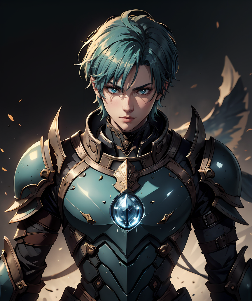 (шедевр, лучшее качество, HDR:1.2), стройный Воин, 1 мужчина, красивое лицо, детализированное лицо, броня, перчатка, трассировка лучей, фантастический фон, короткие волосы цвета морской волны, <lora:GoodHands-beta2:1>, <lora: more_details:0.25>, <lora:Fantasy_warriors__-_by_HailoKnight:0.75>