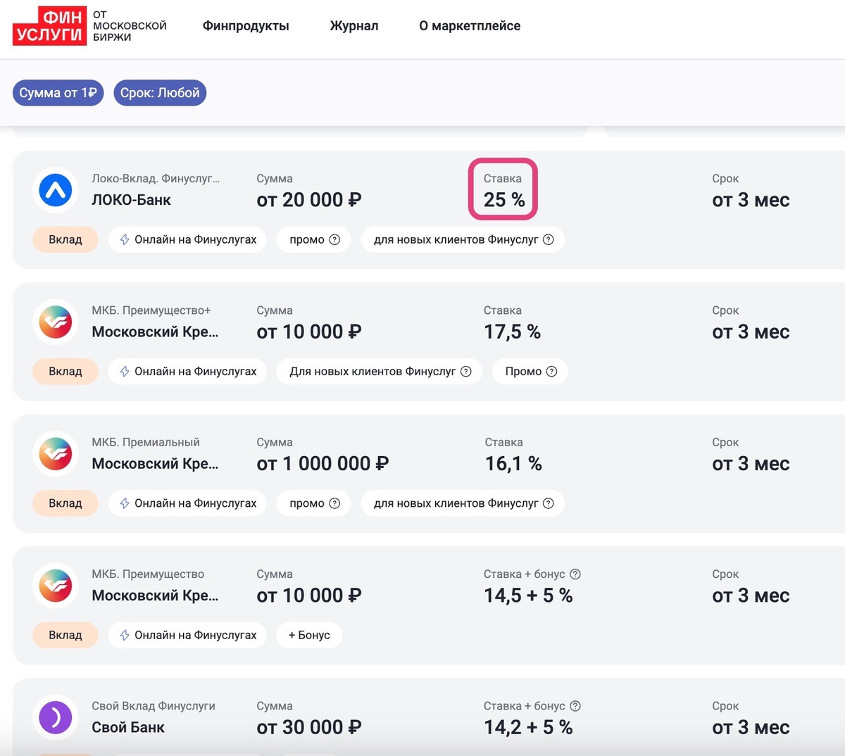 Обновлено: сейчас на Финуслугах есть и вклады под 25% годовых.