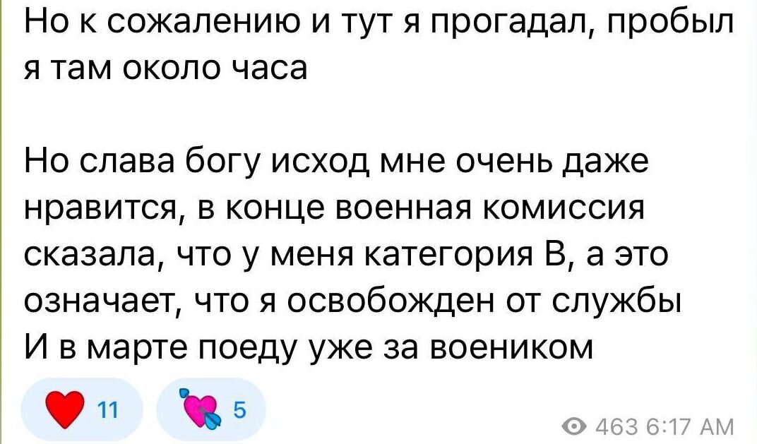 Псевдокандидат на пост мэра Новосибирска обрадовался освобождению от призыва Новосибирский блогер, обратившийся к Екатерине Мизулиной с требованием закрыть ЛГБТ*-бар, поблагодарил бога за освобождение от службы в армии.Владислав Пушкин в своих соцсетях рассказал подписчикам, как он побывал в военкомате. — Ну слава богу, исход мне даже очень нравится. В конце военная комиссия сказала, что у меня категория В, а это означает, что я освобожден от службы. И в марте поеду уже за военником, — сообщил сибиряк. Пушкин также опубликовал у себя на странице видео из скандально-известного Nebar, где он веселится.Напомним, о блогере из Новосибирска узнали после видеообращения к главе «Лиги безопасного интернета» Екатерине Мизулиной. Владислав, представился будущим мэром города Новосибирска, попросил проверить бар «Элтон» на пропаганду ЛГБТ*и закрыть его так же, как одноименное заведение в Красноярске.— Считаю, что мы не должны отставать от Красноярска, и поэтому нам необходимо в кратчайшие сроки при