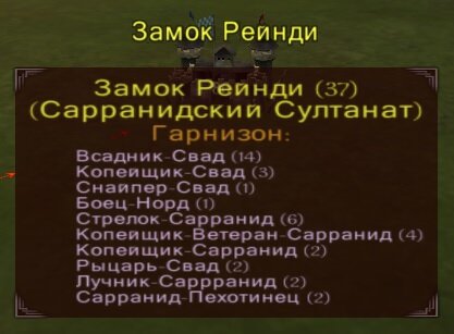 Что ж, отданные мною замки переходили из рук в руки. И вот они у Сарранидского Султаната. Я посмотрел что там с замком Дерчиос – совсем мало, неинтересно. А вот в замке Рейнди: Можно преподать урок хороших манер, лишним не будет. Пару кадров о том как это происходило. Спереди мои самые преданные спутники, далее ряд пехоты и вынужденно спешившихся конников, а далее арбалетчики – их я прихватил с собой немало. Как только арбалетчики истратили все болты, я отдал приказ к атаке. Мои потери при осаде: Я хотел интересного, так вот дальше стало очень интересно. Пришёл босс: Его отряд: 113 мамлюков и 158 вкачанных лучников – впечатляет (там ещё с ним второй стоял какой-то микроб на фоне своего босса – 35, в основном не шибко вкаченные арбалетчики-родоки). Я постараюсь дать достойный отпор. Тем более немного временя у меня есть; и я быстро сбегал до Дирима, где у меня, как я уже писал, элитные дружинники, и взял сколько смог. Итого я получил 77 в замке и 145 с собой, вот состав: Итак, нача