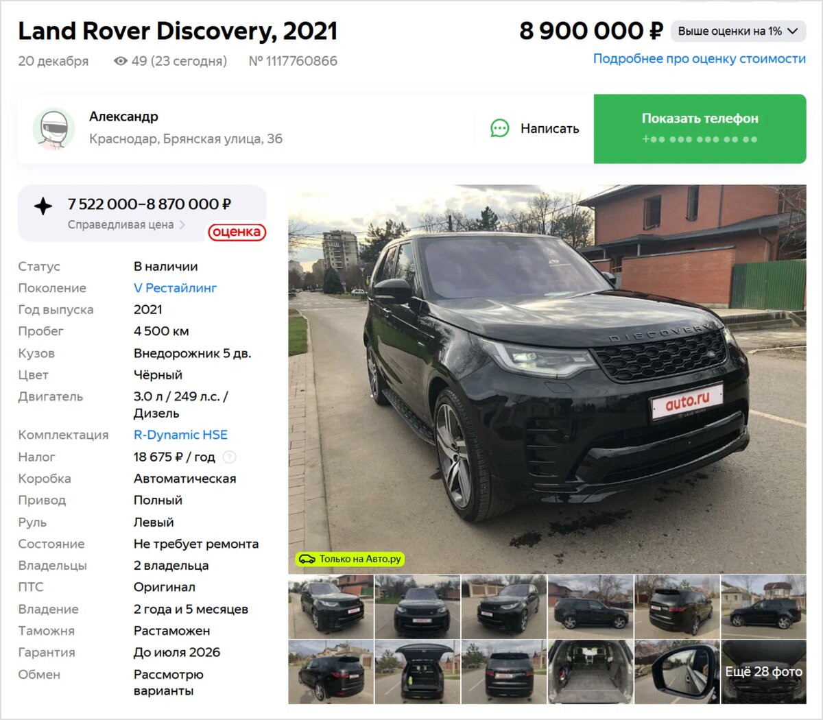 Перед нами внедорожник Land Rover Discovery 2021 года выпуска, который продают в Краснодаре. На одометре менее четырёх с половиной тысячи километров, а выглядит машина просто отлично. Хотят за неё 8,9 миллиона рублей. Вообще, таких автомобилей на Авто.ру немного, а стоимость этого экземпляра соответствует середине рынка.