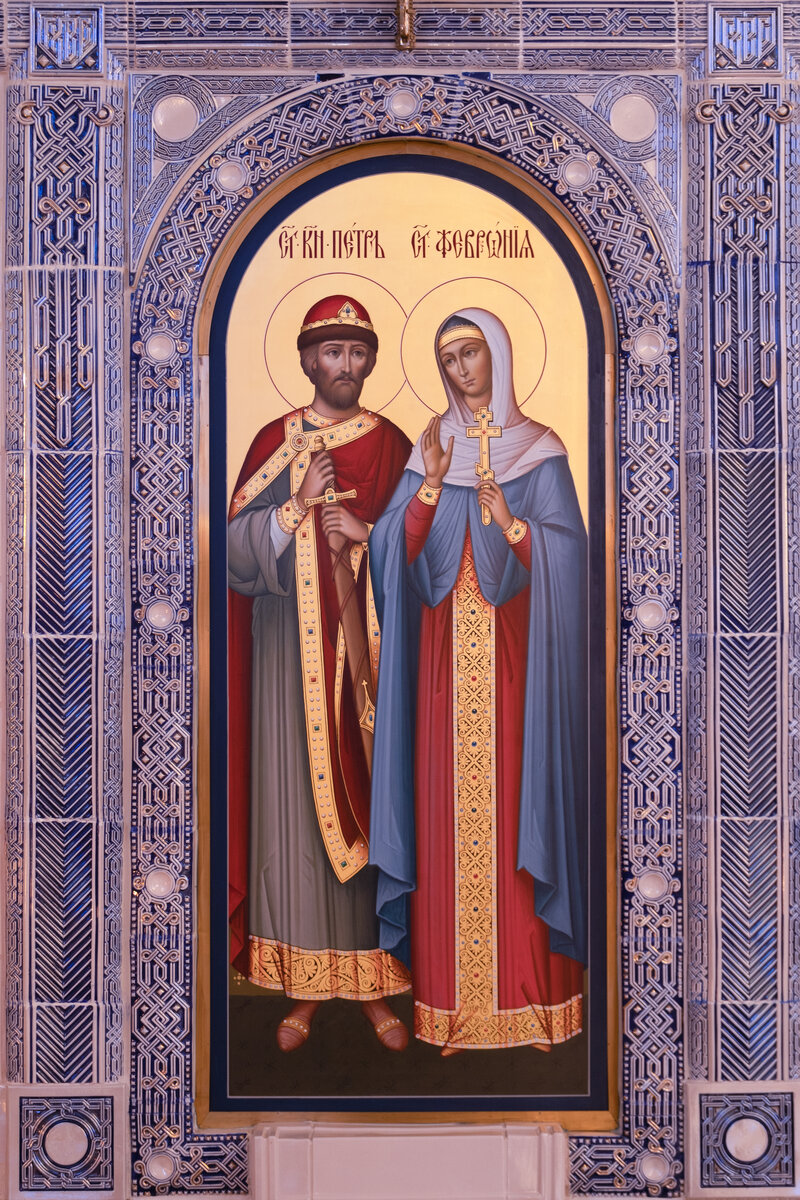 В Нижнем храме Главного храма Вооруженных Сил России расположена икона Святых благоверных Петра и Февронии Муромских. Согласно жизнеописанию святых, за несколько лет до княжения Петр заболел проказой. Никто не мог излечить его от этого недуга. Вскоре будущий правитель увидел во сне знамение, согласно которому исцелить его может дочь пчеловода - Феврония, крестьянка деревни Ласковой в Рязанской земле. Девушка была красива, благочестива и добра, к тому же она умела врачевать многие болезни. Князь полюбил ее и дал обет жениться после выздоровления. Когда это случилось, монарх не сдержал своего обещания. Болезнь вернулась, но Феврония снова вылечила Петра – и тот наконец женился. Но бояре не пожелали, чтобы княгиней стала девушка из народа и потребовали развода. Петр, когда узнал, что его хотят разлучить с любимой женой, решил отказаться от княжения и богатства. Супруги покинули Муром, отплыв на лодке по реке Оке. Вскоре в городе началась смута, вся знать перессорилась вплоть до кровопроли