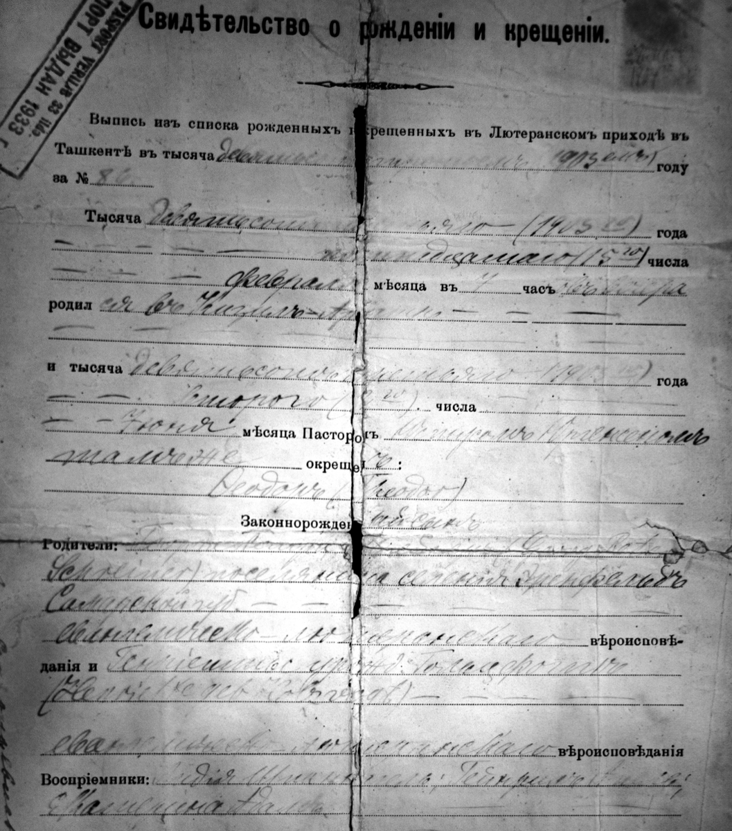 В моей истории с немецкой веткой дедушки таким документом оказалось свидетельство о рождении моего прадеда Теодора Петровича Шрейнера. Да, вот этот выцветший и протертый на сгибах лист:
