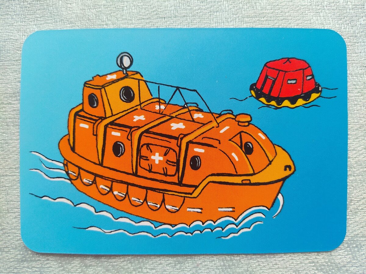 На рисунке мы видим спасательный плот и шлюпку, плывущие по спокойным волнам. Людей здесь не видно, но можно понять, что они находятся на борту.
