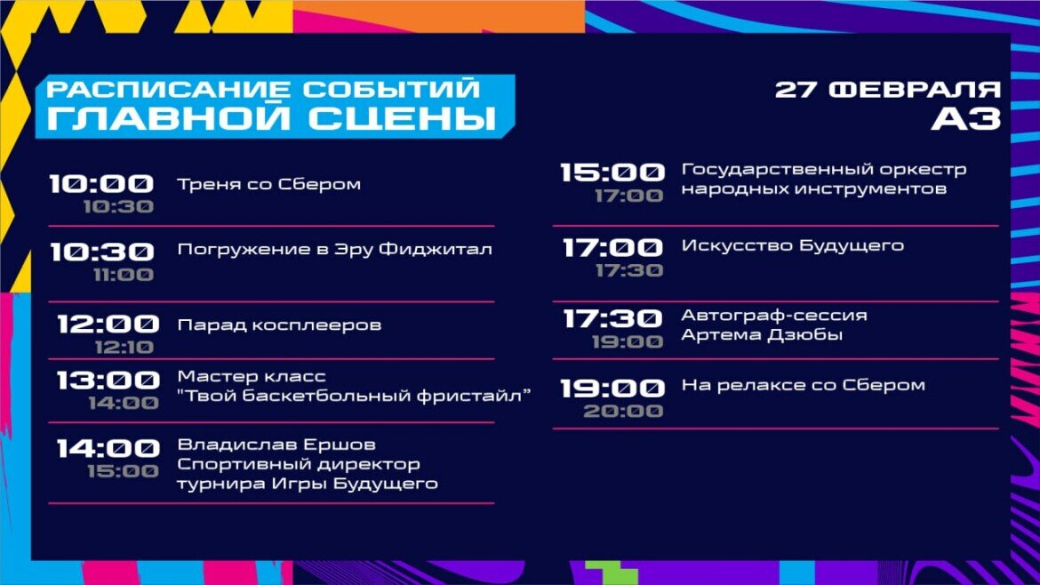 В 12:00 состоится традиционный парад косплееров, а в 13:00 на главной сцене начнется мастер-класс «Твой баскетбольный фристайл». Затем в 14:00 запланирована встреча со спортивным директором турнира Владиславом Ершовым. Музыкальное исполнение представит Государственный оркестр народных инструментов в 15:00, а в 17:30 амбассадор «Игр Будущего» Артем Дзюба проведет автограф-сессию.