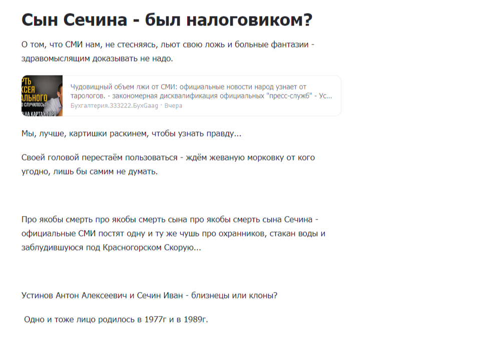 Вчера я разместила скрины из общедоступных всем (а не только мне) источников про сына Сечина, которого в СМИ объявили умершим. Странное дело - у сына Сечина одно лицо с племянником Сечина, который его старше на 12лет. А племянник Сечина - прямой родственник одного из скропостижно скончавшихся после Брежнева генсеков. И нет, это все честные люди. И нет, они все нажили честным трудом, оплачиваемом согласно тарифной сетке. И нет, их опубликованные биографии тоже честные. И нет, информация о Сечине и его семье и трагедии тщательно затерта по всему интернету. И нет, это не связано с огромными деньгами. Нет, все происходит просто так, без умыслов и замыслов. Вот, как есть, так и написано. Как написано, так и есть. И нет, описанная в интернета трагедия - чистая случайность. И нет, версия со смертью сына Сечина, который имеет одну фотку с племянником Сечина, имеет место быть по наспех срежессированной постановке. И нет, все так и было, как опубликовано. И да, посмотрите, открывается