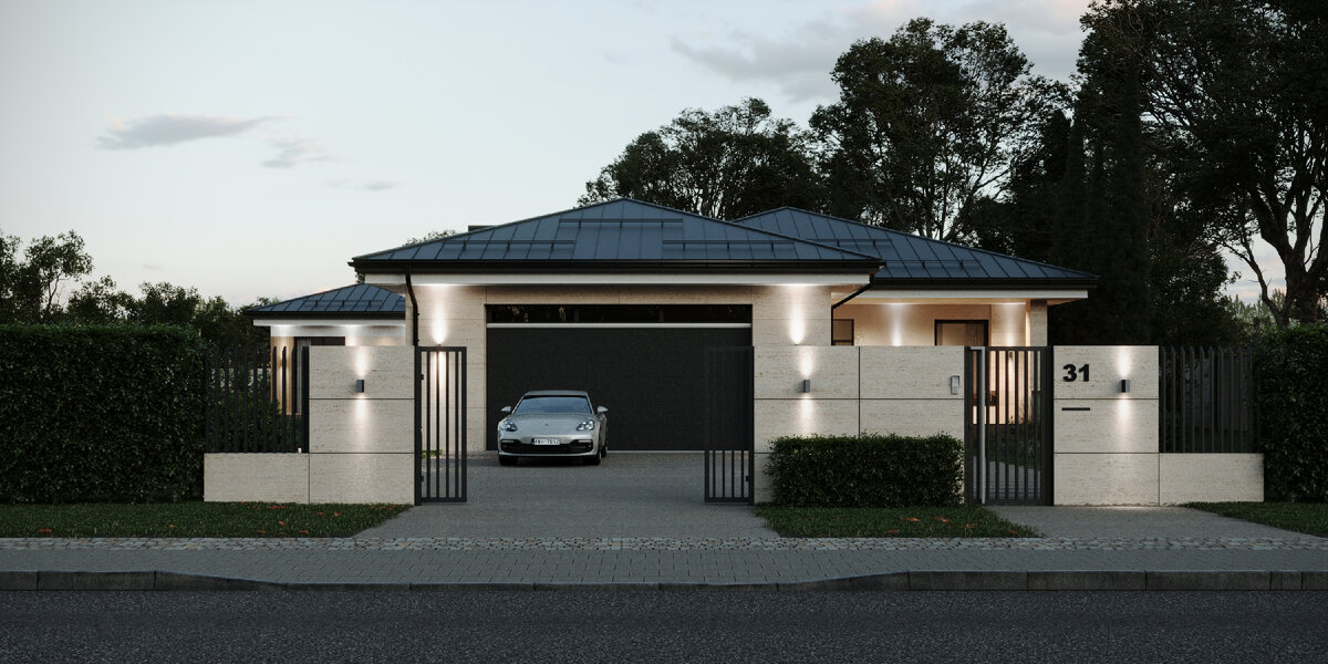 Наш капризный климат с перепадами от -40 до +40 сильно отличается от итальянского, но почему бы не вдохновиться средиземноморским настроением и не спроектировать загородную резиденцию, напоминающую об отпуске? Для наших заказчиков – семьи с двумя маленькими детьми – это первый опыт загородного строительства, но они пришли с чётким представлением об идеальном доме. Мы лишь зафиксировали их пожелания и принялись за дело. По периметру участка расположены дом и баня, в центре – патио с неглубоким бассейном. Для большего уюта и интимности дом спрятан от посторонних глаз и не просматривается. При этом, благодаря продуманной архитектуре, маленькие дети всегда остаются в поле зрения хозяйки. Дом состоит из двух частей: гостевой и хозяйской. В гостевой помимо гостиной небольшой санузел с душевой, а также спальня для бабушки. Для взрослых хозяев мы сделали спальню с проходной гардеробной. Разделителем для этих зон стала перегородка с телевизором. Это решение позволило сэкономить место на коридор