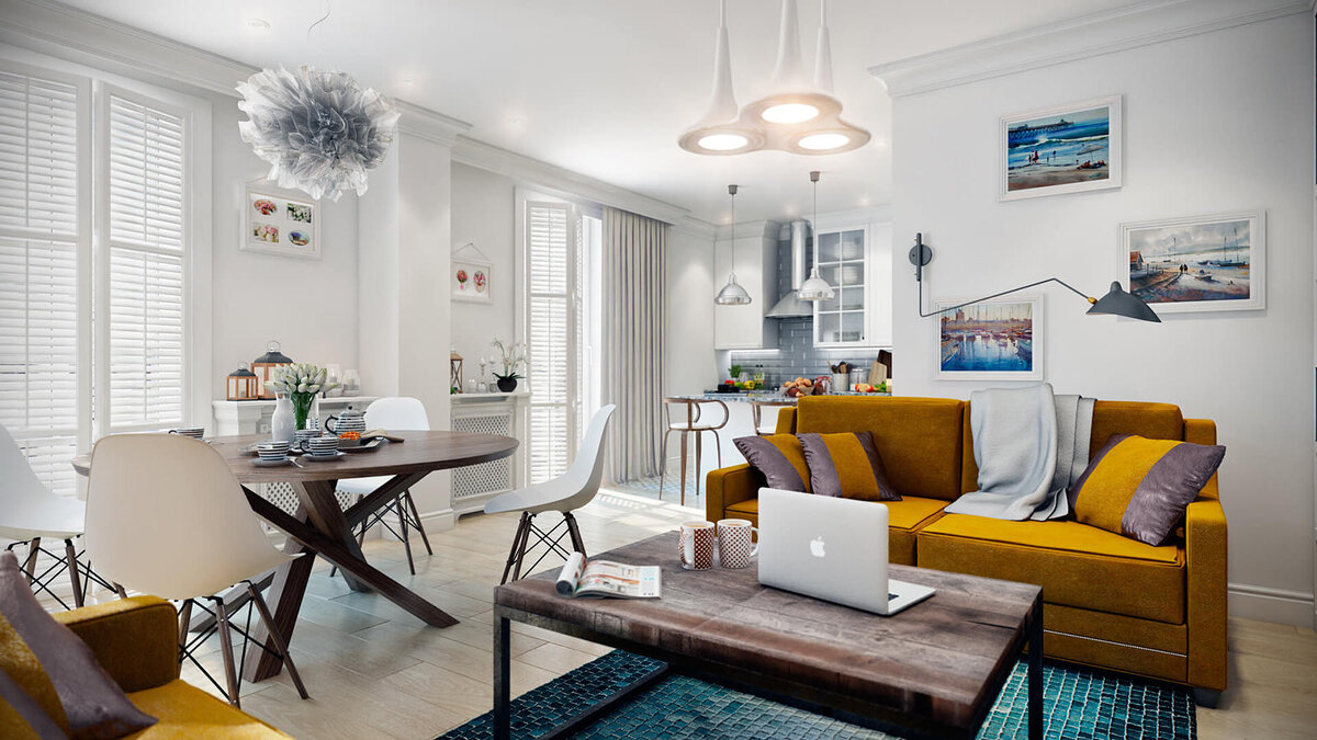Льняные портьеры прекрасно впишутся в скандинавский стиль гостиной, объединенной с обеденной зоной. Выбирают необработанный лен, либо крашеный в светлые тона с добавлением вискозы в составе. Такие шторы не будут давать усадку при стирке, их легче гладить и драпировать.