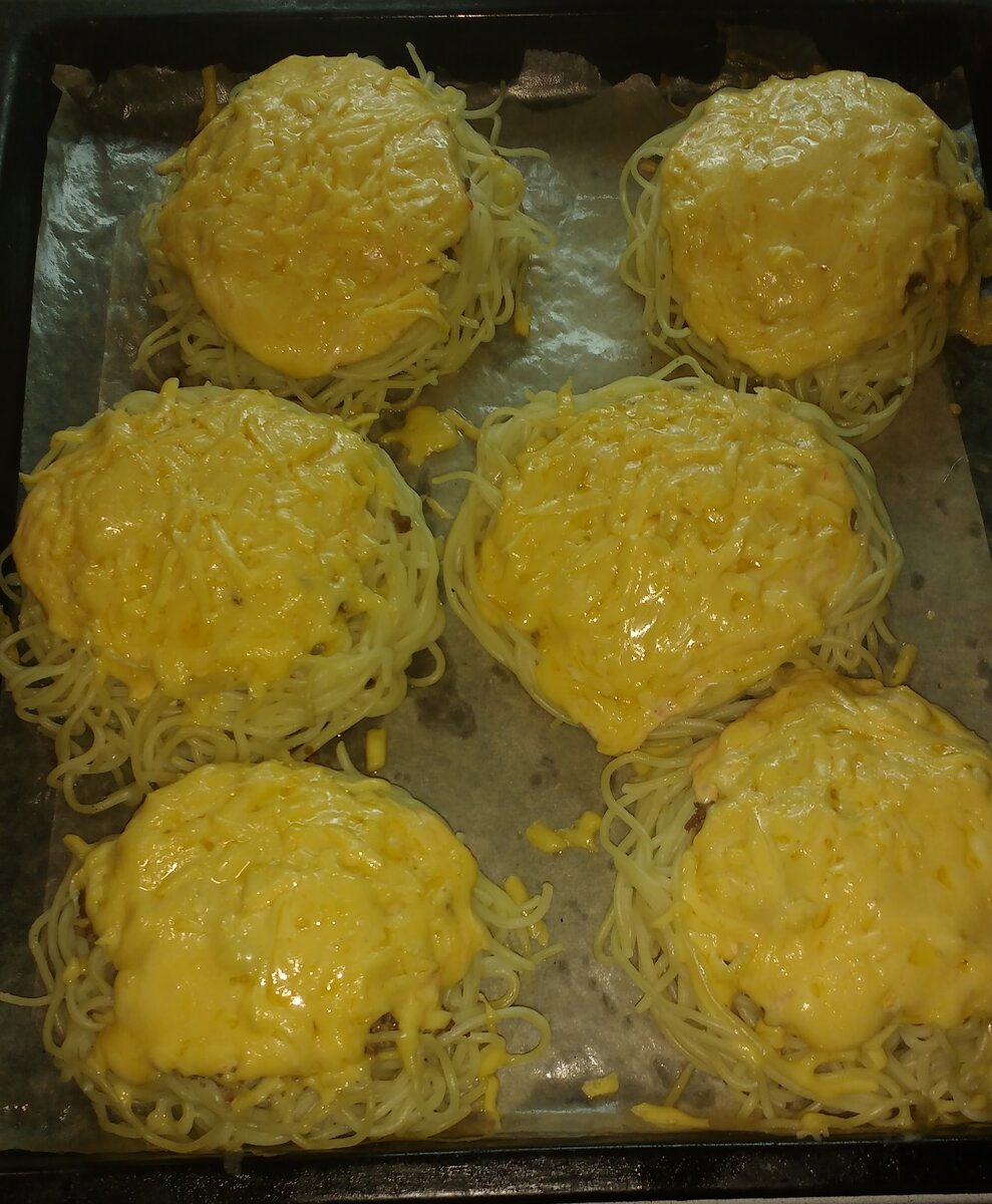 Долго думала, что приготовить сегодня на ужин, и решила — будут гнезда из спагетти! Так как мой муж и дочь обожают макароны, мне приходится их готовить чуть ли не каждый день, а простые отварные с котлетами и т.д. быстро надоедают, нужно включать фантазию, чтобы хоть как-то разнообразить этот гарнир. Ингредиенты Приготовление Начнем с начинки. Режем мелко лук и отправляем на сковороду с разогретым маслом. Обжариваем до золотистого цвета. К луку на сковороду отправляем фарш и обжариваем до готовности. За минут пять до готовности солим и заправляем любимыми специями наш фарш. Пока жарился фарш, я успела отварить спагетти. Теперь укладываем на противень бумагу для выпечки, слегка смазываем маслом и формируем из спагетти гнезда. Конечно, проще купить готовые макаронные изделия в виде гнезд, но я, как говорит мой муж, легких путей не ищу. Да и ехать до ближайшего маркета 2 км, поэтому как-то так... Ах да, чуть не забыла про соус. Для этого смешиваем майонез с домашней аджикой. Острота ушла,