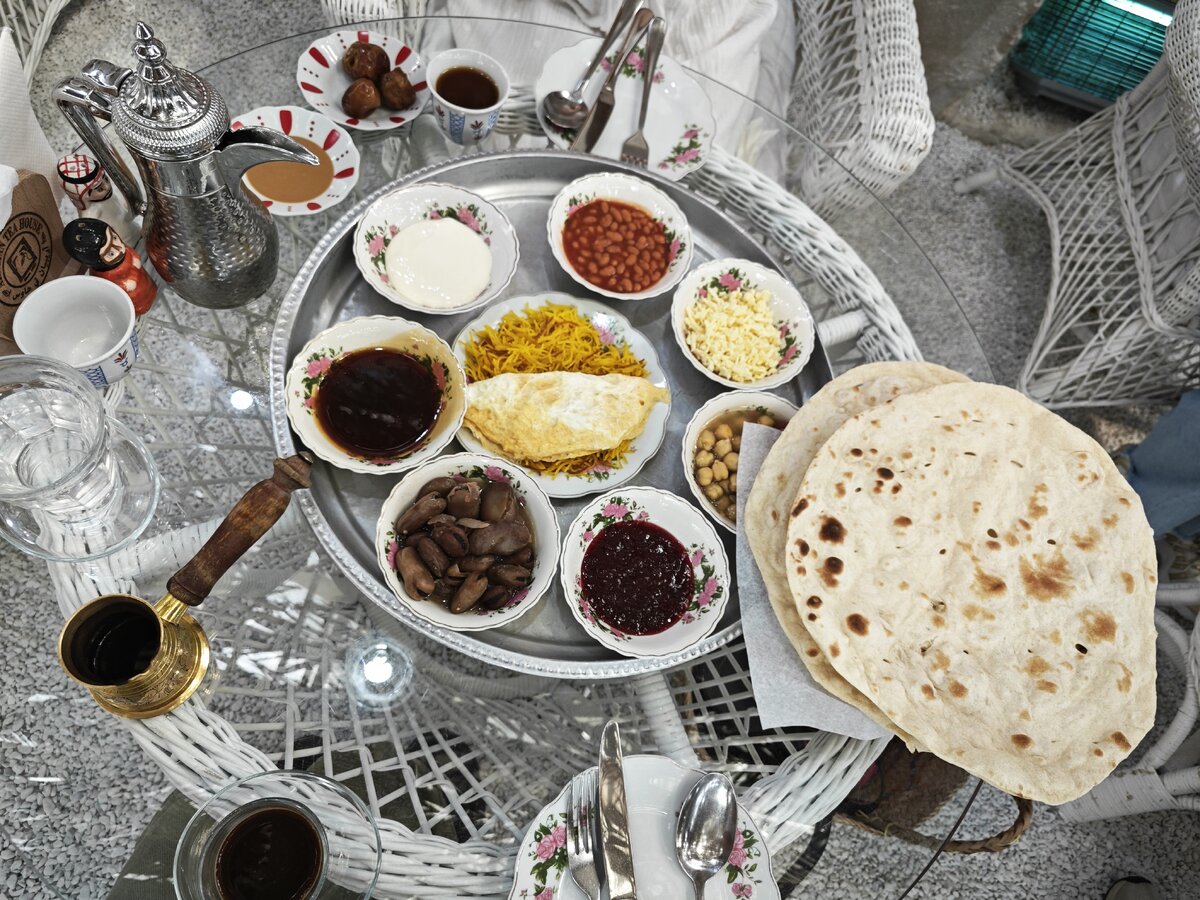Традиционный арабский завтрак чем-то похож на турецкий: на стол кладут небольшие тарелочки с местными блюдами.