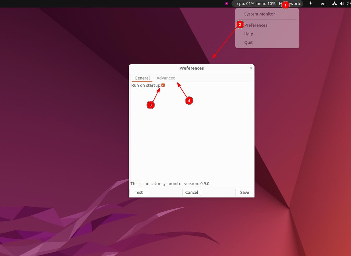 sudo apt-get install indicator-sysmonitor Далее в трее ставим галочку запускать при старте. И переключаемся на вкладу с боп парамтерами Создаем исполняемый файл в директории пользователя с названием hello.sh nano ~/hello.sh Со следующим содержимым #!/usr/bin/env sh
