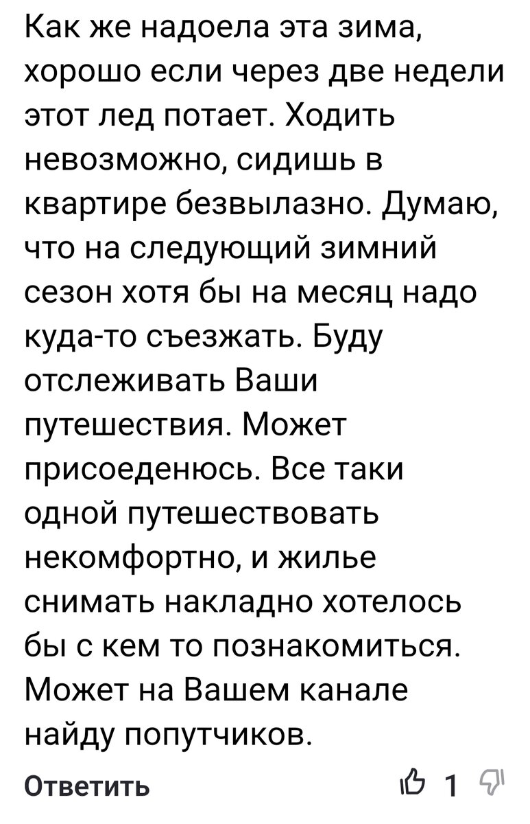 Мне то особо зима не надоела, потому-что я к ней всего 27 дней назад приехала. И знаю, что скоро уеду снова Но понимаю всей душой эту женщину. Вы моë отношение к зиме давно знаете. Наверное и правда нам таким, не любящим всë это, лучше уезжать. Я то в этом убедилась, уехав в Абхазию в декабре. Да и дело то не в любви или нелюбви, а в том, как человек чувствует. себя . В здоровье. И не только здоровье тела, а и здоровье духа. Для меня лично психо- этоциональное состояние очень много значит. Но я не о себе сейчас, а о тех, кто хочет уезжать на зиму туда, где теплее и солнечнее. Мне бы очень хотелось всем помочь. Мне часто пишут, что неплохо бы к нам присоединиться или попутчиков хотят найти. Ну к нам то можно, но это тоже имеет свои рамки. Не всегда ведь человек может тогда, когда едем мы, ну и много других нюансов существует. А вот попутчиков найти - хороший вариант. Но как это сделать? Кому-то я и смогла в этом помочь. Но это мало. Я всë время думаю, как бы это организоват