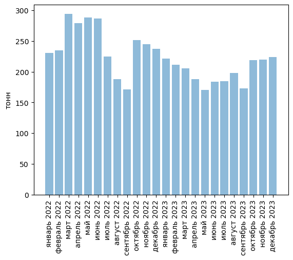 Мы видим, что наибольших значений производство достигло в марте 2022 года и составило 294 тонн. Наименьшие показатели зафиксированы в мае 2023 года: 170 тонн.