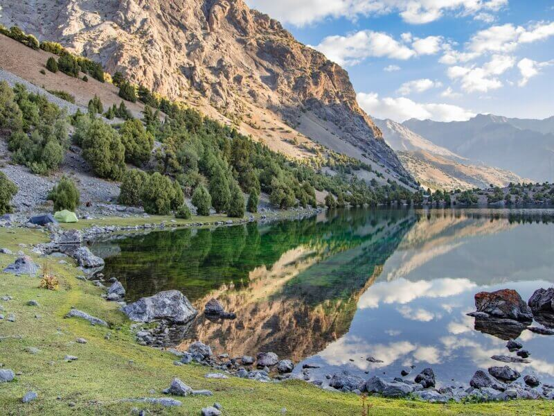 На расположенных здесь девяти вершинах высотой более 5000 м очень любят тренироваться к восхождениям альпинисты со всех уголков мира. Помимо заснеженных пиков, тут можно полюбоваться водной жемчужиной – знаменитым озером Искандеркуль.