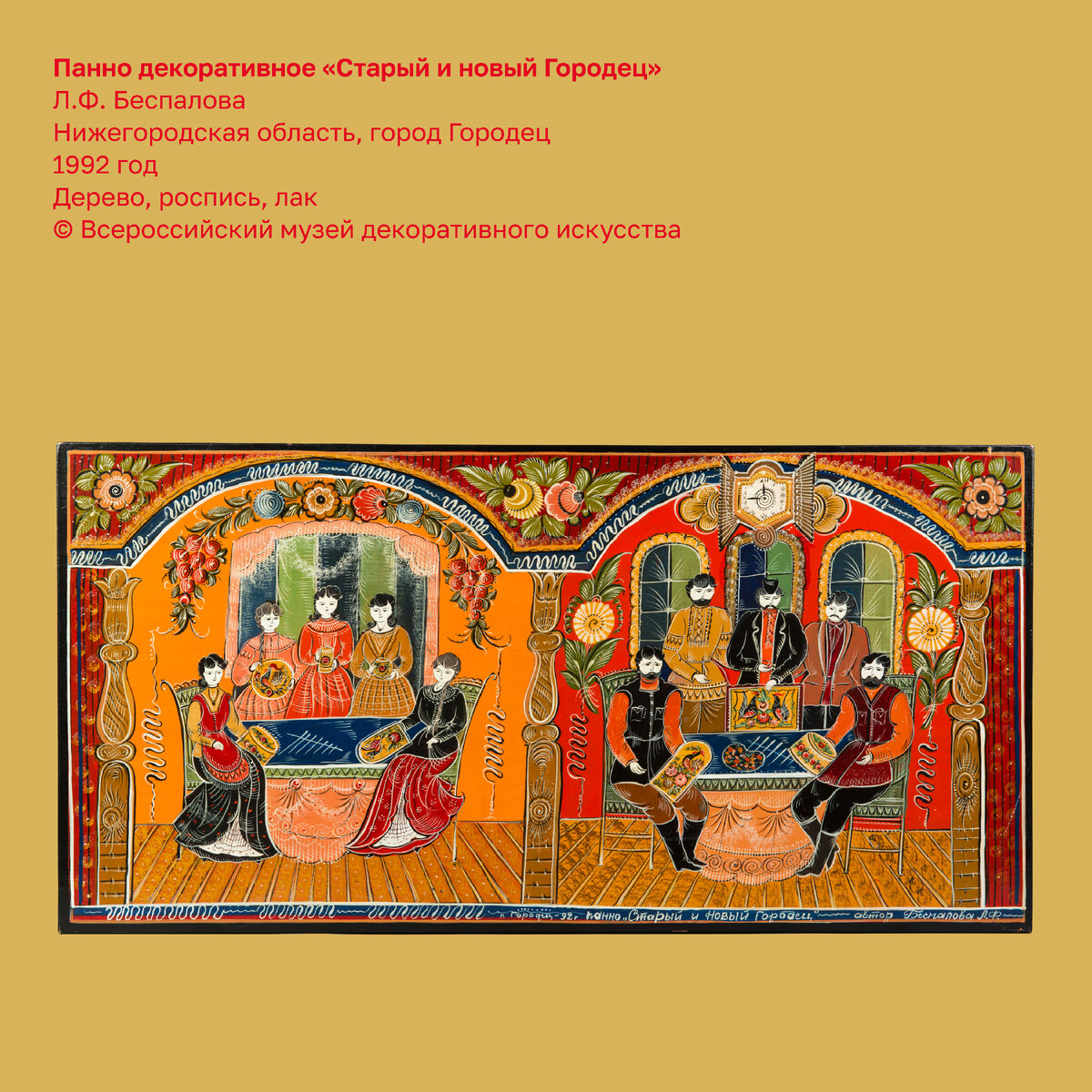 Городецкая роспись - особый вид росписи по дереву, который появился в середине XIX века в Нижегородской губернии, в районе города под названием Городец. Изначально визитной карточкой Городца были резные прялки, которые изготавливали жители близлежащих деревень. Сначала узор создавали с помощью вставок из других пород дерева, затем резной орнамент стали подкрашивать, а еще позже роспись полностью вытеснила резьбу. Городецкие прялки отличались от обычных тем, что их не вытачивали из цельного куска дерева, а изготавливали из двух частей — гребня и донца. Донце представляло собой широкую доску: с одного конца она сужалась, и в этом месте делали отверстие для ножки гребня. Как раз донце и было расписным: когда прялкой не пользовались, ее вешали на стену в качестве украшения. Украшая свои изделия, мастера придерживались традиционной композиционной схемы. Изделие делилось на две зоны, в верхней части помещался основной «сюжет», это мог быть бравый всадник на коне, гуляющая парочка, сцена ча