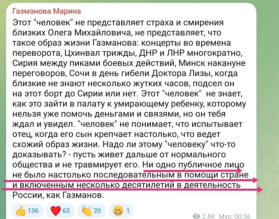 В преддверии недавнего дня защитника Отечества в сети объявилась Марина Газманова, супруга главного есаула страны. Ей не понравился, что какой-то блогер в очередной раз усомнился в патриотизме певца. (Впрочем, не он один, об этом в сети пишут очень часто). И Марина решила рассказать о величии мужа и его неоценимом вкладе в страну. Выяснилось, что Олег Михайлович как никто другой помогал России. Вот, собственно сам пост: Напомню, что история любви Марины и Олега довольно необычная. Их отношения завязались, когда певец находился в браке. В семье подрастал Родион, уходить от супруги Газманов не собирался. Тогда Марина назло вышла замуж за Вячеслава Мавроди, брата основателя скандальной пирамиды МММ. Когда в компании начались проблемы (Марина работала в МММ бухгалтером - по ее словам. А по слухам - финансовым директором), она собрала вещи и ушла от Вячеслава. Газманов не только принял бывшую возлюбленную, но и стал приемным отцом для ее сына от Мавроди. Именно в особняке певца Марина от