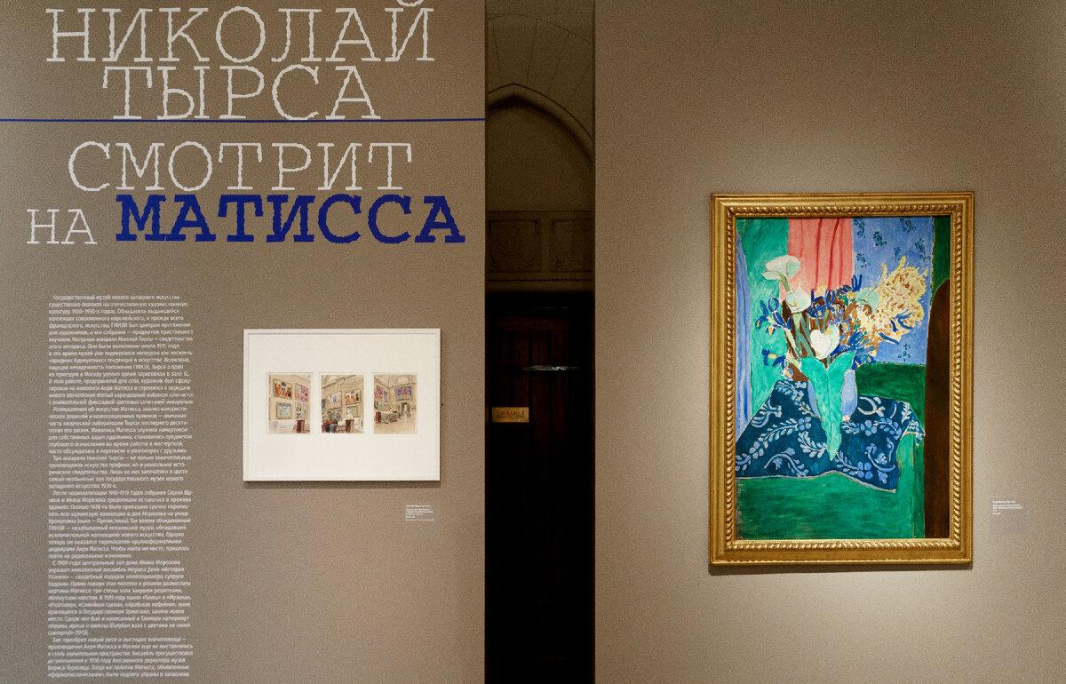 В экспозиции будут впервые показаны акварели Николая Тырсы, на которых запечатлен зал Анри Матисса в Государственном музее нового западного искусства (ГМНЗИ), а также некоторые произведения, располагавшиеся в этом пространстве, и архивные материалы. В один из приездов в Москву ленинградский художник Николай Тырса уделил время зарисовкам в зале №12 ГМНЗИ. Благодаря им мы можем представить, как выглядел в цвете зал с картинами Матисса. Они являются живым свидетельством колоссального интереса отечественных художников к искусству французского мастера. Вступительная статья в каталоге персональной выставки Тырсы, проходившей в Пушкинском музее в 1969 году, начиналась словами Матисса: «Художник должен уметь всю жизнь смотреть на мир глазами ребенка», «должен видеть все так, как если бы он видел это в первый раз». На выставке работы Николая Тырсы будут соседствовать с картиной Анри Матисса «Арумы, ирисы и мимоза (Голубая ваза с цветами на синей скатерти)» (1913) и скульптурой Ришара Гино «То