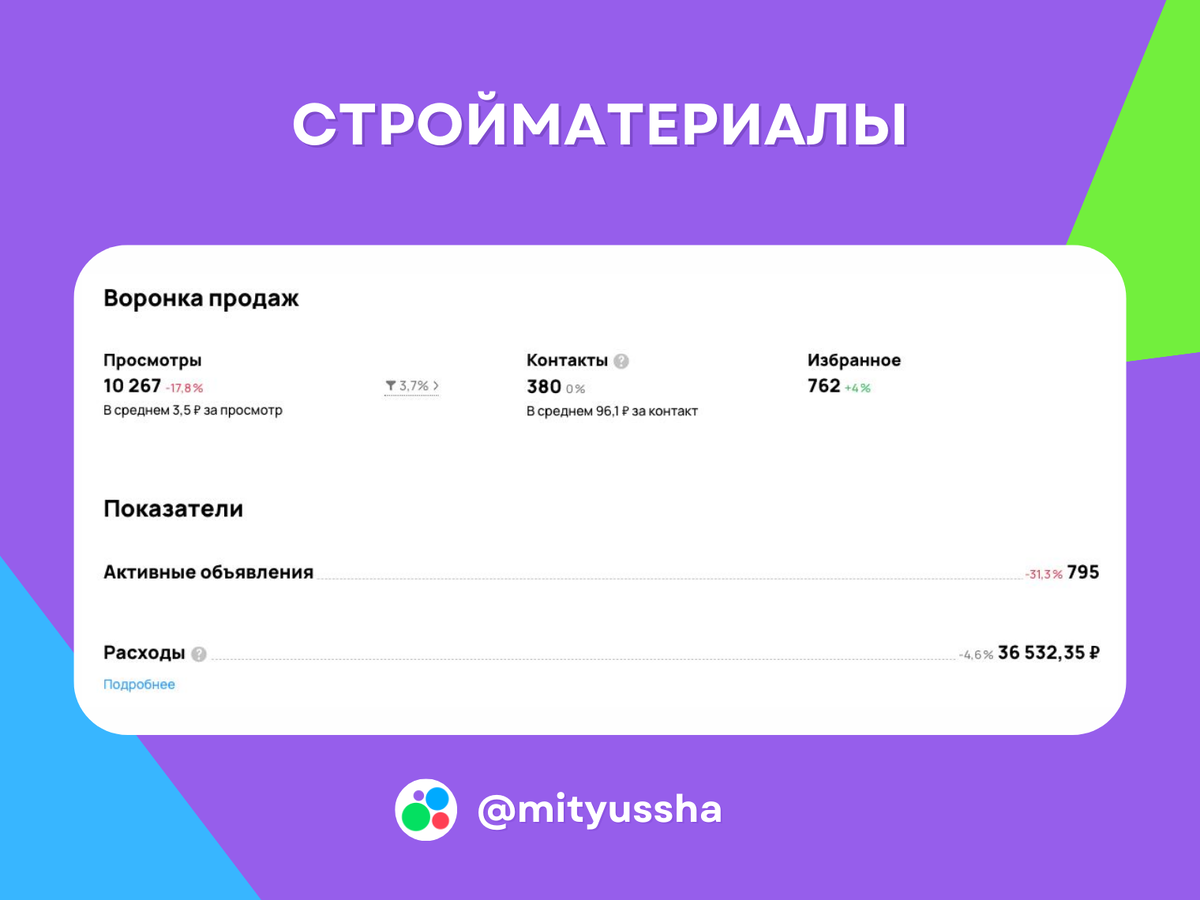 К нам обратился заказчик, ниша – стройматериалы. Компания обратилась с запросом размещения рекламы на Авито сразу нескольких позиций товаров. Мы составили стратегию согласно пожеланиям клиента и столкнулись с некоторыми трудностями. Основным препятствием была частая блокировка наших публикаций. После анализа ситуации и внесения необходимых корректировок в стратегию, мы смогли размещать более 500 объявлений и обеспечивать стабильные лиды. Стратегия и реализация: → Результаты рекламной кампании за 1 месяц: ✓ 10267 просмотров ✓ 380 контактов ✓ 762 добавлений в избранное ✓ 96.1 руб – средняя стоимость контакта Благодаря результатам за первый месяц мы продолжаем работать с заказчиком и масштабируем продвижение чтобы получить еще больше заявок. В период весенне-летнего сезона мы наблюдаем значительный рост спроса на строительные материалы. В связи с этим, если вы планируете начать размещение стройматериалов на Авито, рекомендуем приступить к подготовке уже сейчас, в конце февраля. Оптимальны