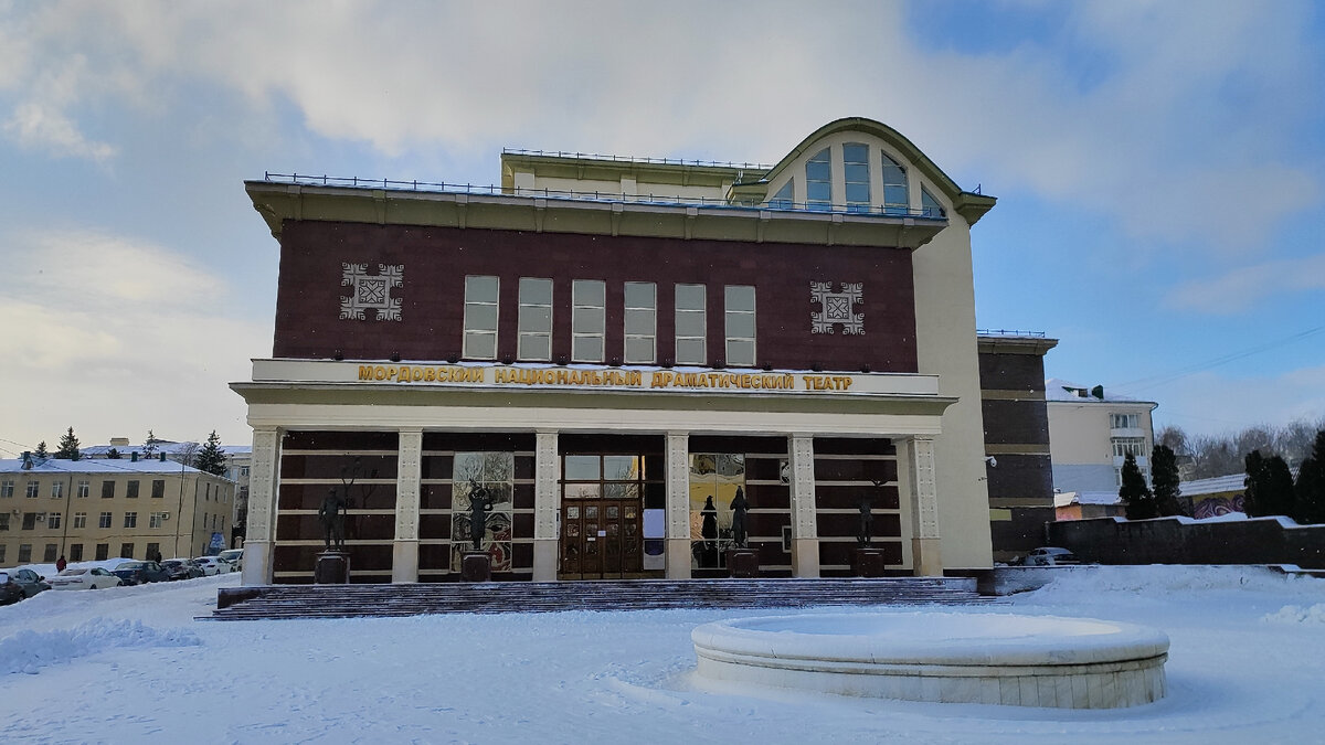 Заключительная часть прогулки по Саранску. В предыдущей части мы прогулку закончили в сквере Славы (ссылки на первые части в конце поста). Пройдя через который, можно подняться к современному Дому печати. Но самое интересное нас ждет по диагонали от этого Дома печати: там выделяется новое здание, 2007 года постройки – это Национальный драматический театр Отделка театра сделана с использованием мордовского орнамента. А у главного входа, среди колонн, установлены 4 фигуры: опирающийся на посох старик, юноша с птицей в руках, мокшанка с веткой яблони и эрзянка с чашей в руках. Что обозначают сие скульптуры - ответ на этот вопрос я не нашёл. И перед входом – снова площадь с фонтаном. Вообще, в Саранске обилие фонтанов. Постановки, между прочим, в этом театре выходят на трех языках – русском, эрзянском и мокшанском. Опять указатель с лисой во главе А напротив театра сохранилось здание начала 20 века И в это здание обязательно нужно заглянуть. Ведь там размещается музей Мордовской народной