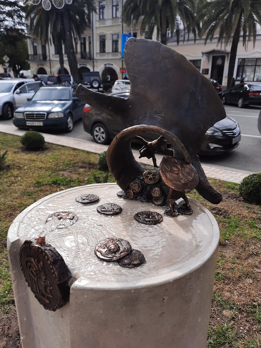 В Сухуме, на проспекте Леона, перед Музеем Банка Абхазии в марте прошлого года появился питьевой фонтан скульптора Архипа Лабахуа. «Похищение монет Ацанами» - так автор назвал свою работу. Фонтанчик представляет собой горловину кувшина, из которого два гнома - ацана пытаются утащить монеты. Это уже девятая малая скульптурная форма Архипа Лабахуа, которая украшает столицу. Место выбрано со смыслом – перед входом в Музей истории Нацбанка Абхазии, в коллекции которого представлены монеты и денежные знаки античности, средних веков, Российской империи, периода Октябрьской революции (1917-1923 гг.), СССР и современной Абхазии. Но фонтан абсолютно лишен пафоса – на лаконичный светлый постамент из горлышка разбитого кувшина (или выловленной со дня сухумской бухты античной амфоры?) сыплются монеты, и разворачивается неясная интрига с участием двух ацанов! Один тащит на голове монету, закрывающую его сверху, как щит, а второй подсматривает за ним из горлышка, и непонятно, ч