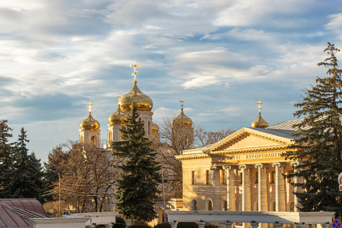 Тема нынешней статьи - прогулка по красивому городу. А потому, достопримечательности я упоминать буду, но в контексте прогулки. Ну, как будто вы гуляете с приятным вам человеком и ведете легкую и необязывающую беседу. А свет вокруг волшебный. Причем, мы были в Пятигорске несколько раз, правда, в одно и то же время года – в январе. И примерно в одно и то же время суток - в закатные часы. Погода и свет при всех посещениях города были идентичными! Божественно золотым! Может просто повезло, может, это типичная погода для Пятигорска. Исторический центр окрашен в привычный для зданий 19 века желтый цвет. С 1817 года существовал императорский указ - красить фасады домов в определенные цвета. Среди них был «Палевый» — светло-желтый, соломенный, бело-желтоватый. В этот цвет и окрашены здания в Пятигорске. Ну, те что окрашены. Потому что много из дикого камня. "Дикий" цвет — цвет необработанного гранита указом Александра I тоже дозволялся. Так вот, палевый в сочетании с золотыми куполами церквей, да еще вечером в «золотой» час дает совершенно сказочный эффект.